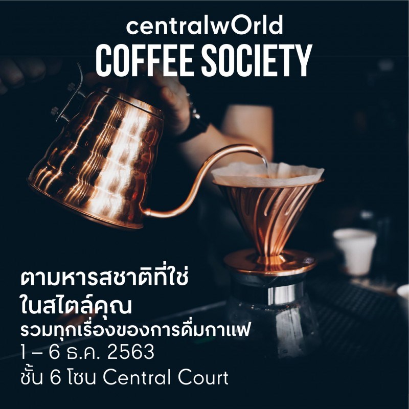 Coffee Society วันที่ 1 - 6 ธันวาคม 2563 ณ ชั้น 6 โซน Central Court ศูนย์การค้าเซ็นทรัลเวิลด์ centralwOrld Coffee Society งานที่รวบคาเฟ่ร้านเด็ดร้านดัง ที่สาย Cafe Hopping ต้องไป! นำมาไว้ในงานนี้แบบจัดเต็ม แอบกระซิบชื่อร้านที่บอกเลยว่าห้ามพลาด Invisible Coffee room Pour Over Lab Summer Coffee What the Hecks coffee Roaster The breakfast club Kancha la.moon Bialetti KeepCup Eco.llective Dolce Gusto Celebread.TH Chak-a roi Seen Bangkok มาตามหารสชาติของกาแฟที่ใช่ในสไตล์คุณ รวมทุกเรื่องของการดื่มกาแฟ ยกร้านกาแฟชื่อดังมาดริปให้ถึงที่ เลือกซื้อเมล็ดกาแฟแบรนด์ดัง พร้อมอุปกรณ์การชงกาแฟและขนมหวาน ที่ให้คุณได้ทานเพื่อเพิ่มอรรถรสการดื่มกาแฟ พร้อมมาแลกเปลี่ยนประสบการณ์กับบาริสต้าร้านดัง และเหล่า Coffee Lover ที่มีความชอบเหมือน ๆ กัน centralwOrld Coffee Society วันที่ 1-6 ธ.ค. 2563 ชั้น 6 โซน Central Court ศูนย์การค้าเซ็นทรัลเวิลด์