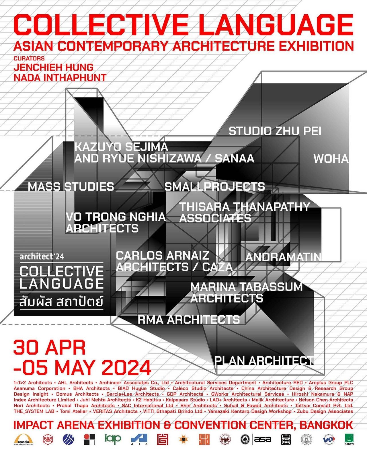 นิทรรศการสถาปัตยกรรมครั้งแรกประจำปี 2024 นิทรรศการสัมผัสสถาปัตย์ภาษาร่วมสมัยแห่งภูมิภาคเอเชีย (Collective Language: Asian Contemporary Architecture Exhibition) ที่ IMPACT Arena Exhibition and Convention Center จะเปิดตัว อย่างเป็นทางการในวันอังคารที่ 30 เมษายน ภายใต้ งานสถาปนิก’67 นิทรรศการงานแสดงเทคโนโลยีสถาปัตยกรรม และผลิตภัณฑ์ก่อสร้างใหญ่ที่สุดในอาเซียน จัดโดยสมาคมสถาปนิกสยามในพระบรมราชูปถัมภ์ ร่วมกับ บริษัท ทีทีเอฟ อินเตอร์เนชั่นแนล จำกัด โดยมี เจอร์รี่ หง (Jenchieh Hung) ประธานคณะทำงานนิทรรศการจากสมาคมสถาปนิกสยามฯ ผู้ร่วมก่อตั้งและสถาปนิกหลักจาก HAS design and research เป็นหัวหน้าภัณฑารักษ์ และนาดา อินทพันธ์ จากสมาคมสถาปนิกสยามฯ เป็นภัณฑารักษณ์ร่วมของนิทรรศการ