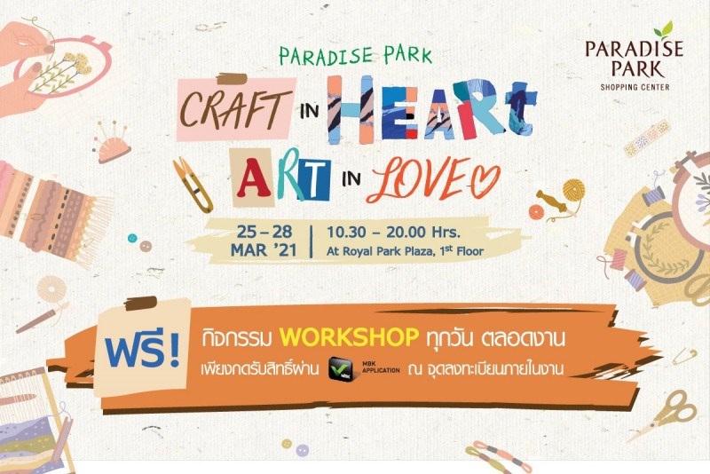Craft In Heart Art In Love วันที่ 25 - 28 มีนาคม 2564 ณ บริเวณ Royal Park Plaza ชั้น 1 Paradise Park เอาใจคนรักคราฟต์ ช้อปเพลินกับงานคราฟต์หลากหลายดีไซน์และงานหัตถศิลป์ หัตถกรรมไทยสุดเก๋ พร้อมกิจกรรมเวิคช้อปดี ๆ ภายในงาน