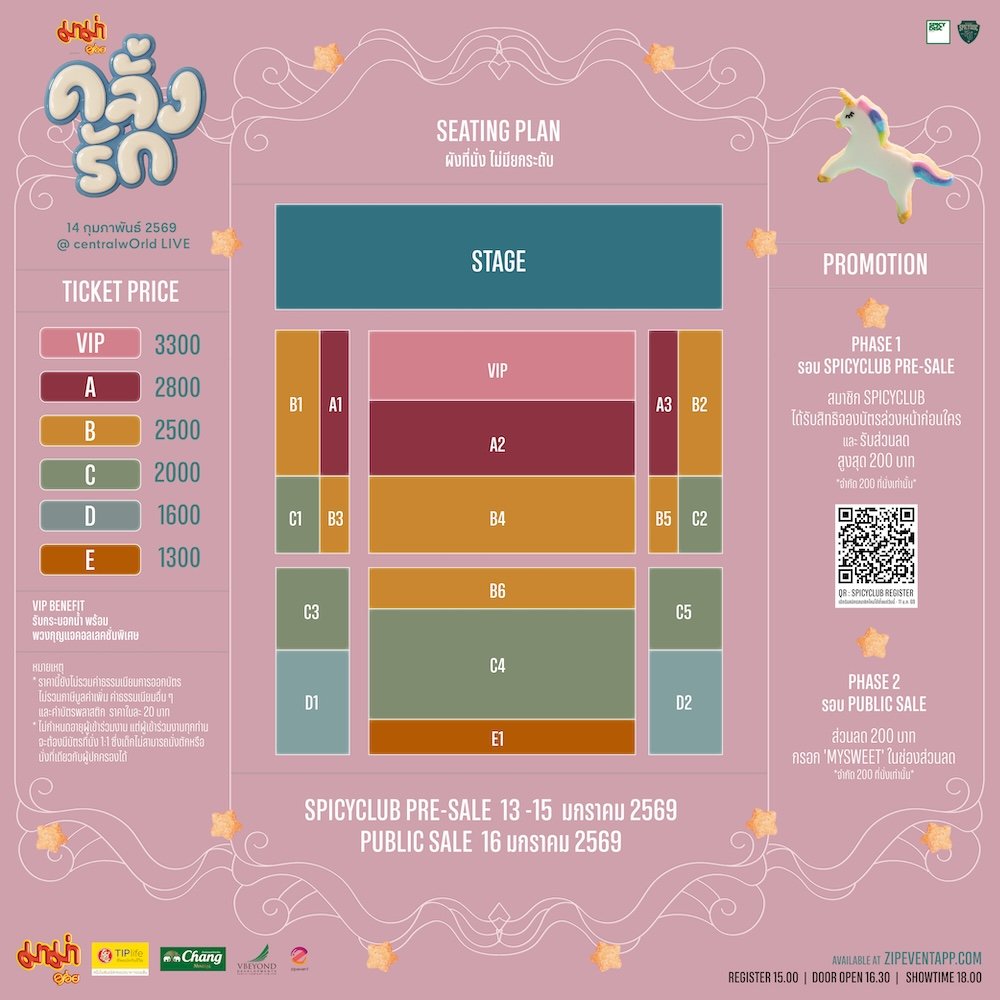- เปิดจําหน่ายบัตรล่วงหน้า (PRE-SALE SPICY CLUB) พร้อมกันวันอังคารที่ 13 มกราคม 2569 เวลา 12:00 น. - วันพฤหัสบดีที่ 15 มกราคม 2569 เวลา 23:59 น. หรือจนกว่าที่นั่งตามสิทธิ์จะหมด