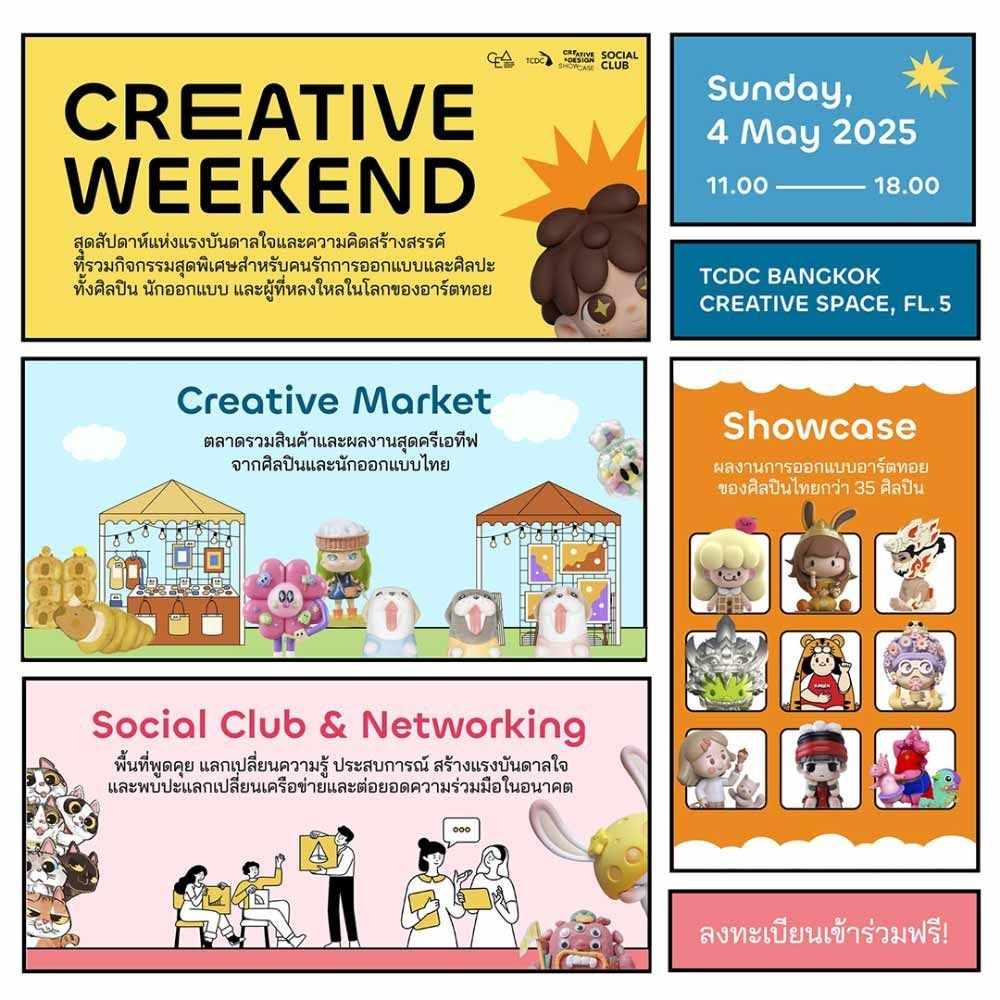 Creative Weekend งานที่รวมกิจกรรมสุดพิเศษสำหรับคนรักการออกแบบและศิลปะ ทั้งศิลปิน นักออกแบบ และผู้ที่หลงใหลในโลกของอาร์ตทอย มาร่วมเปิดมุมมองและเรียนรู้ทักษะใหม่ ๆ ที่จะช่วยกระตุ้นความคิดสร้างสรรค์ของคุณ