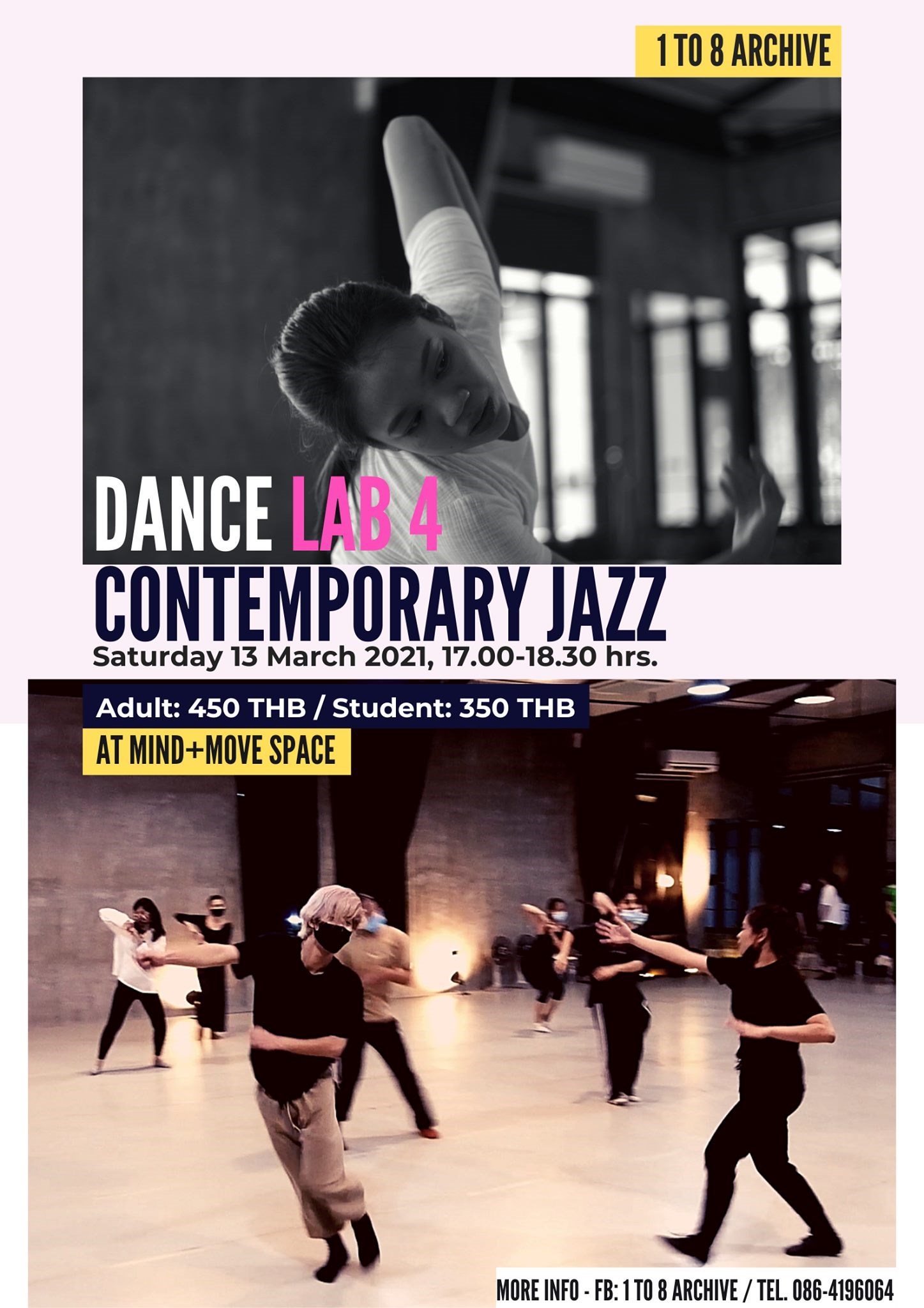 เดือนมีนาคมนี้ 1 to 8 Archive ขอเชิญทุกท่านมาร่วมเต้นรำใน Dance Lab 4: Contemporary Jazz แล็บที่จะพาทุกท่านมาทำความรู้จักกับเทคนิคและกลิ่นอายของการเต้นแจ๊สผ่านวิธีการของ Contemporary Dance นำคลาสโดย ภาวิดา วชิรปัญญาพร นักเต้นร่วมสมัย