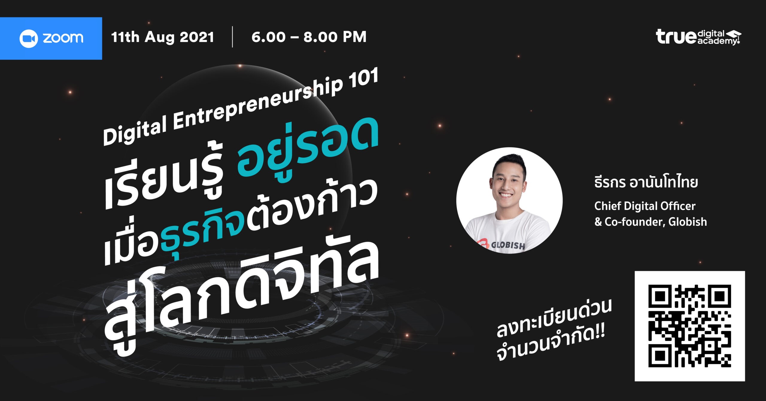 เรียนรู้การเป็นผู้ประกอบการดิจิทัล (Digital Entrepreneur) เพื่อคว้าโอกาสทางธุรกิจให้อยู่รอดจากการถูก “Disrupt” และ พร้อมรับมือความท้าทายใหม่ๆ ที่คนทำธุรกิจต้องเผชิญ โดยในคลาสนี้พบกับวิทยากร คุณแทน ธีรกร อานันโทไทย Chief Digital Officer & Co-founder, Globish ที่จะมาถ่ายทอดจากประสบการณ์ถึงวิธีการ และสกิลจำเป็นในการนำเอาเทคโนโลยีเข้ามาช่วยขับเคลื่อนพัฒนาธุรกิจของทุกคนได้แบบง่ายๆ สามารถนำไปต่อยอดธุรกิจของตนเองได้ทันที