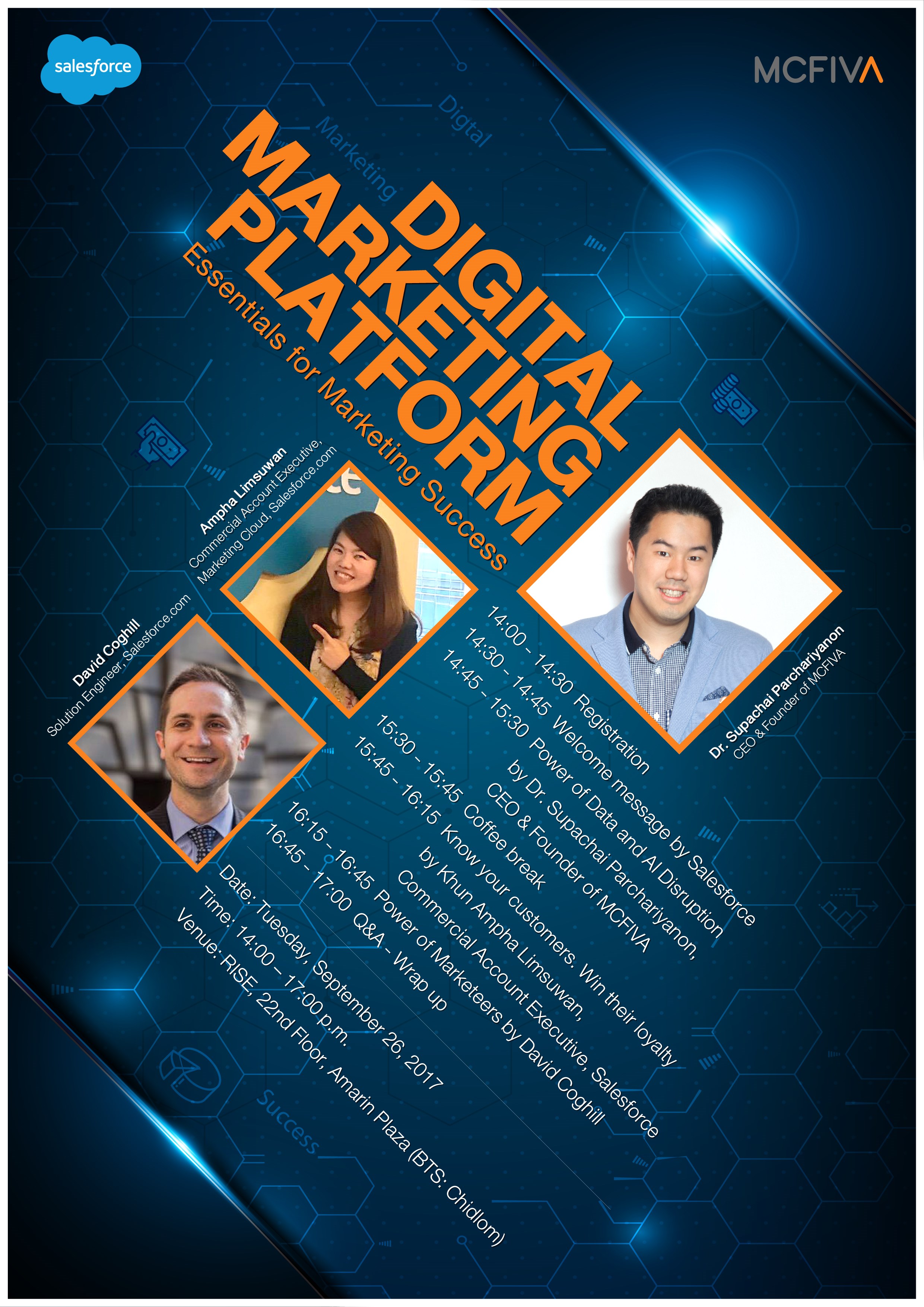ในโลกยุคปัจจุบันการเปลี่ยนแปลงเข้าสู่การนำเทคโนโลยีนั้นถือเป็นกุญแจสำคัญในการดำเนินธุรกิจ โดยเฉพาะการทำการตลาดผ่านระบบออนไลน์นั้น ที่เป็นที่แพร่หลายในทั้งบริษัท ขนาดเล็ก ขนาดกลาง และขนาดใหญ่ จึงได้เกิดความร่วมมือระหว่าง บริษัท ดิจิทัล เอเจนซี่ อันดับต้นๆของไทยอย่าง MCFIVA ที่นำโดย นายแพทย์ศุภชัย ปาจริยานนท์ Founder and CEO พร้อมด้วย David Coghill, Solution Engineer และคุณ Ampha Limsuwan, Commercial Account Executive, Marketing Cloud จาก Salesforce.com ที่จะมาร่วมแบ่งปันประสบการณ์ที่น่าสนใจ ในวงการธุรกิจที่ ประยุกต์ใช้การเข้ามาของเทคโนโลยี (Digital trend) มาพัฒนาและเสริมสร้างความสำเร็จให้กับองค์กรอย่างมีประสิทธิภาพ และสร้างสรรค์ เพื่อเตรียมรับมือกับโลกยุคปัจจุบันที่กำลังเปลี่ยนแปลงไปอย่างรวดเร็ว รวมไปถึงพลังในการนำ Data เพื่อ Disrupt ตลาดด้วยระบบสมองกล หรือที่การทำการตลาดระบบอัตโนมัติ (Digital Marketing Automation) เพื่อความรวดเร็ว และตอบสนองความต้องการของลูกค้า อย่างตรงจุด