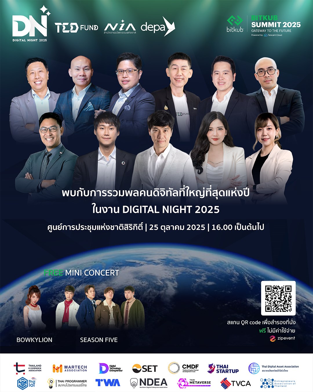 งาน Digital Night 2025 ร่วมกับ Bitkub Summit 2025 และ 12 สมาคมดิจิทัล จัดงาน Networking ของชาวดิจิทัลที่ยิ่งใหญ่ที่สุดแห่งปี ไม่ว่าจะเป็นภาครัฐ เอกชน หรือ สตาร์ทอัพ ในงานนี้เปิดโอกาสให้ทุกท่านได้เข้าร่วมฟังทิศทางวงการดิจิทัลจาก Speaker ชั้นนำของประเทศ อาทิเช่น:
