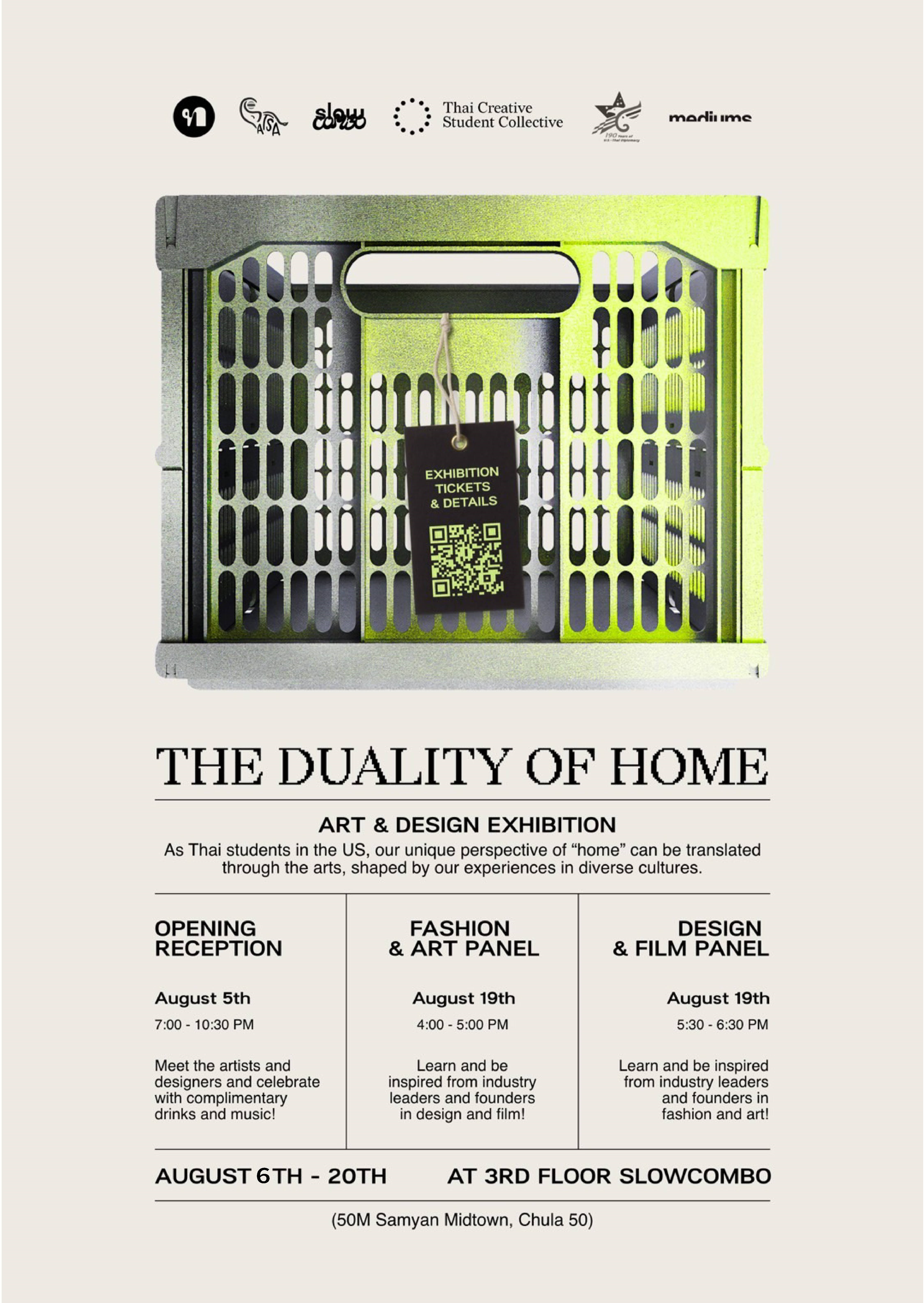 นิทรรศการ “The Duality of Home” แสดงผลงานศิลปะและการออกแบบหลากหลายแขนงที่สะท้อนและถ่ายทอดมุมมองที่เกิดจากแรงบันดาลใจและการหล่อหลอมประสบการณ์ของนักเรียนไทยในสหรัฐอเมริกาที่จากบ้านเดิมมาพบวัฒนธรรมและสิ่งแวดล้อมของบ้านใหม่ จัดโดย Thai Creative Student Collective (TCSC) องค์กรที่ไม่แสวงหาผลกำไร และเครือข่ายนักเรียนไทยด้านศิลปะและการออกแบบในสหรัฐอเมริกา จัดขึ้นระหว่างวันที่ 6-20 สิงหาคม 2566 ณ Slowcombo ชั้น 3 ซอยจุฬา 50 (ก่อนถึงทางเข้าสามย่านมิตรทาวน์) สามารถเข้าชมฟรี โดยไม่เสียค่าใช้จ่าย