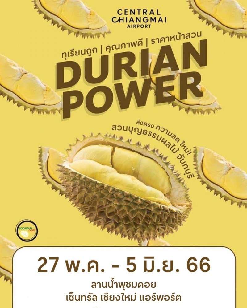 จัดเต็ม ทุเรียนคุณภาพดี ราคาหน้าสวน ส่งตรงจากจันทบุรี มาให้ชาวเชียงใหม่ได้ทานกันแล้ว มีทั้งแบบแกะพูพร้อมทาน หรือจะเลือกแบบทั้งลูก ชั่งตามน้ำหนัก เลือกความสุกได้ตามใจชอบ เลือกซื้อกันยาว ๆ ไปเลย 27 พ.ค. - 5 มิ.ย. 66 นี้ ที่ลานน้ำพุชมดอย