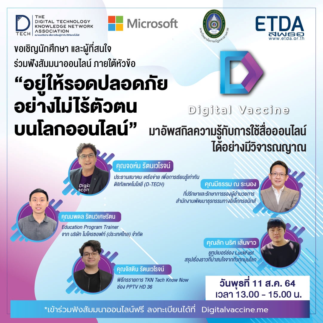 ขอเรียนเชิญนักศึกษา และผู้ที่สนใจทุกท่านเข้าร่วมสัมมนาออนไลน์ฟรี หัวข้อ "อยู่ให้รอดปลอดภัย อย่างไม่ไร้ตัวตน บนโลกออนไลน์” วันพุธที่ 11 สิงหาคม 2564 เวลา 13:00 – 15.00 น. มาอัพเดท 4 ทักษะ กับ 4 ผู้เชี่ยวชาญ