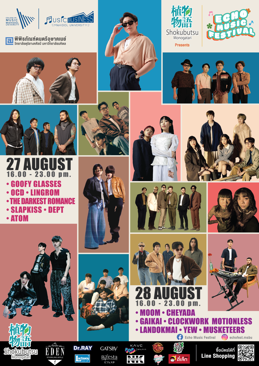 คอนเสิร์ตที่ยิ่งใหญ่ที่สุดในศาลายากำลังจะมาถึง วันที่ 27-28 สิงหาคมนี้ พบกับศิลปินแนวหน้าของประเทศไทย, ศิลปินศิษย์เก่าและหน้าใหม่จากวิทยาลัยมหิดล ในงาน “Shokubutsu presents Echo Music Festival”  ครั้งแรกกับการจัดเทศกาลดนตรีสุดยิ่งใหญ่ในศาลายาโดย Music Business ที่มาพร้อมจัดเต็มกับความสนุก 2 วัน กับ 14 วงดนตรีหลากหลายสไตล์
