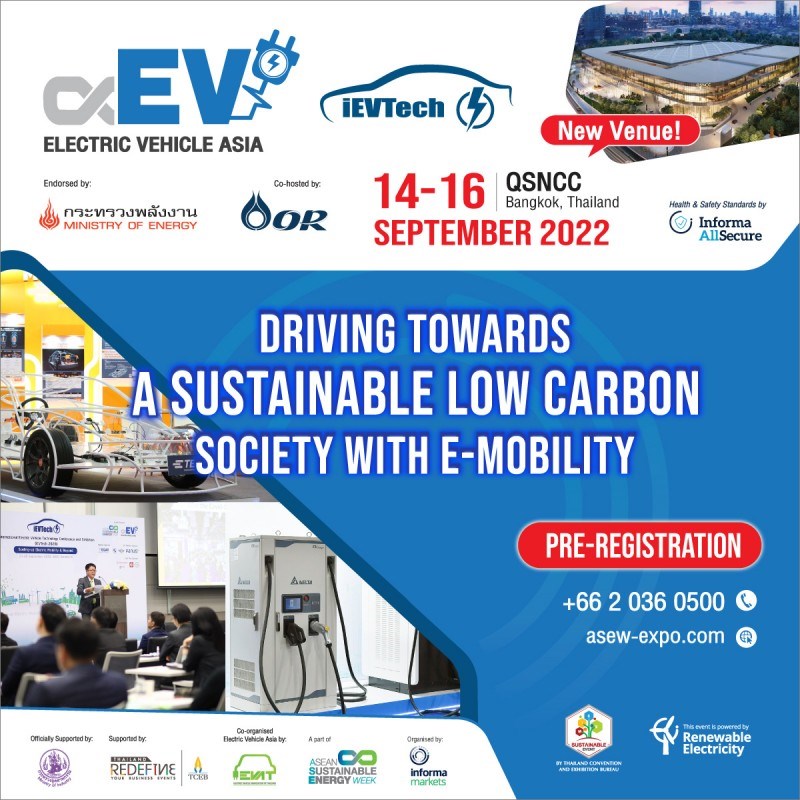 Electric Vehicle Asia 2022 (EVA) วันที่ 14 - 16 กันยายน 2565 ณ QSNCC (ศูนย์ประชุมฯ สิริกิติ์) เส้นทางสู่การพลิกโฉมอุตสาหกรรมยานยนต์ไฟฟ้า งานแสดงเทคโนโลยีและการประชุมเฉพาะด้านเทคโนโลยียานยนต์ไฟฟ้าระดับนานาชาติแห่งเดียวในประเทศไทยเป็นส่วนหนึ่งของงาน ASEW เป็นโอกาสสำคัญในการพบปะบริษัทยักษ์ใหญ่ด้านเทคโนโลยียานยนต์ไฟฟ้า จะมีการประชุมด้านยานยนต์ไฟฟ้าระดับนานาชาติที่สำคัญอย่าง iEVTech ซึ่งจัดขึ้นเป็นครั้งที่ 7 โดยจัดภายใต้หัวข้อ "Future Mobility Aspiration through Bio-Circular-Green Economy within APEC เป็นการประชุมระดับนานาชาติที่รวมตัวของผู้เชี่ยวชาญในสาขาการวิจัย การพัฒนา ผู้กำหนดนโยบาย และซัพพลายเออร์ที่เกี่ยวข้องในอุตสาหกรรม ยานยนต์ไฟฟ้าอย่างแท้จริง ทำไมคุณถึงไม่ควรพลาด อันดับ 1 งานแสดงเทคโนโลยียานยนต์ไฟฟ้าในไทย ผู้เข้าชมงานกว่า 25,000 คน พบผู้แสดงสินค้ากว่า 250 ราย ร่วมโชว์เทคโนโลยี EV จากไทยและต่างประเทศ เปิดประสบการณ์ รถยนต์ไฟฟ้ากว่า 10 แบรนด์ EV ชั้นนำ รวมตัวมากกว่า 60+ กูรู มาแบ่งปันความรู้เชิงลึกเกี่ยวกับอุตสาหกรรม EV