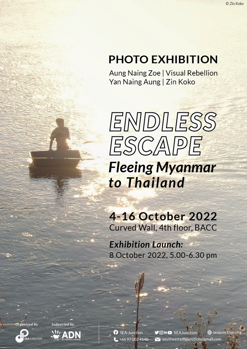 As of February 2022, the Thai government estimated that 17,000 Myanmar refugees had crossed into Thailand. These can be broadly defined into two groups: internally displaced villagers in bordering states seeking temporary refuge due to intensified conflict; and CDM protestors and high-profile individuals seeking longer-term refuge, whether in Thailand or third countries. The photo exhibition "Endless Escape: Fleeing Myanmar to Thailand" to be held by SEA Junction in collaboration with Asia Democracy Network at BACC (Curved Wall, 4th Floor) focuses on the first group. Aung Naing Soe, Visual Rebellion, Yan Naing Aung and Zin Koko capture the cross-over into Thailand and the settling along the 1500 km porous borders when fighting and airstrikes became particularly intense such as in December 2021 and March 2022.