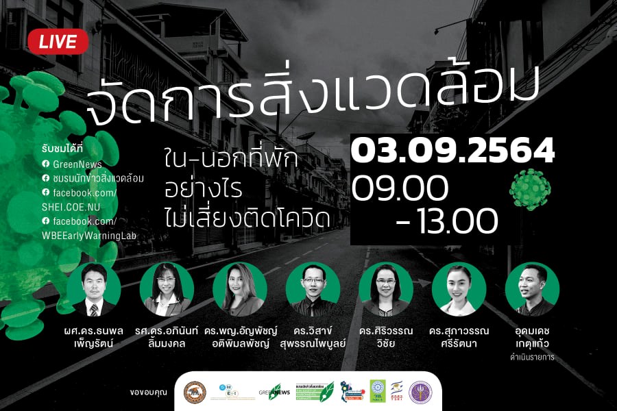 ชมรมนักข่าวสิ่งแวดล้อม ร่วมกับสถานความเป็นเลิศเพื่อความยั่งยืนด้านสุขภาวะ สิ่งแวดล้อม และอุตสาหกรรม คณะวิศวกรรมศาสตร์ มหาวิทยาลัยนเรศวร และภาคีเครือข่าย ขอเชิญผู้สื่อข่าวและผู้ที่สนใจเข้าร่วมเสวนาออนไลน์ "จัดการสิ่งแวดล้อมใน-นอกที่พักอย่างไร ไม่เสี่ยงติดโควิด" วันศุกร์ที่ 3 กันยายน 2564 เวลา 9.00 – 13.00 น.