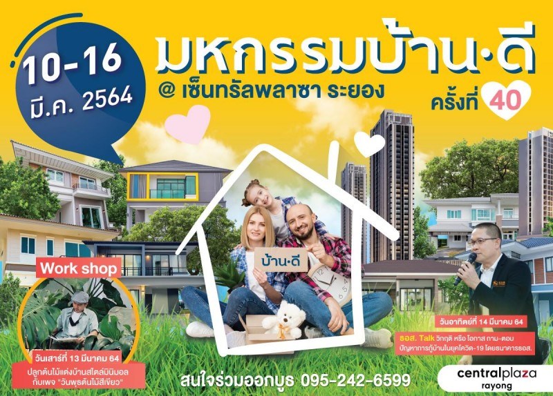 มหกรรมบ้านดี ระยอง ครั้งที่ 40 วันที่ 10 - 16 มีนาคม 2564 ณ ลานกิจกรรม ชั้น 1 เซ็นทรัลพลาซา ระยอง ภายใต้คอนเซปต์ "งานเดียวจบ ครบเรื่องบ้าน" งานรวมโครงการที่อยู่อาศัยที่มากที่สุดในจังหวัดระยอง กระหน่ำโปรโมชั่นสุดพิเศษ! มาฝากทุกท่านภายในงานนี้เท่านั้น! สำหรับใครที่กำลังมองหาที่อยู่อาศัย ไม่ว่าจะเป็นบ้านเดี่ยว บ้านแฝด ทาวน์โฮม คอนโดมิเนียม อาคารพาณิชย์ รวมไปถึงบ้านมือสองอีกหลากหลายรายการ เราคัดมาไว้ให้ท่านได้เลือกสรรแล้ว ที่นี่ที่เดียว มาพร้อมกับกิจกรรมสุดพิเศษ โปรโมชั่นสินเชื่อพิเศษจากธอส. / ปรึกษาทุกปัญหาการยื่นกู้พร้อมประเมินวงเงินกู้กับธนาคารชั้นนำ โครงการบ้านและคอนโดภายในงานมากมาย / พร้อมโปรโมชั่นบ้านเด็ด 7 วันเท่านั้น พบกับบูธ ทรัพย์ NPA จำนวนมากจาก ธอส ราคาลดพิเศษเฉพาะในงานเท่านั้น บ้านมือสองหลายร้อยรายการ ลงประกาศขายบ้านมือ 2 ฟรีที่งานมหกรรมบ้านดี กิจกรรมพิเศษ พร้อมของแถมมากมายจากโครงการที่ร่วมออกบูธ
