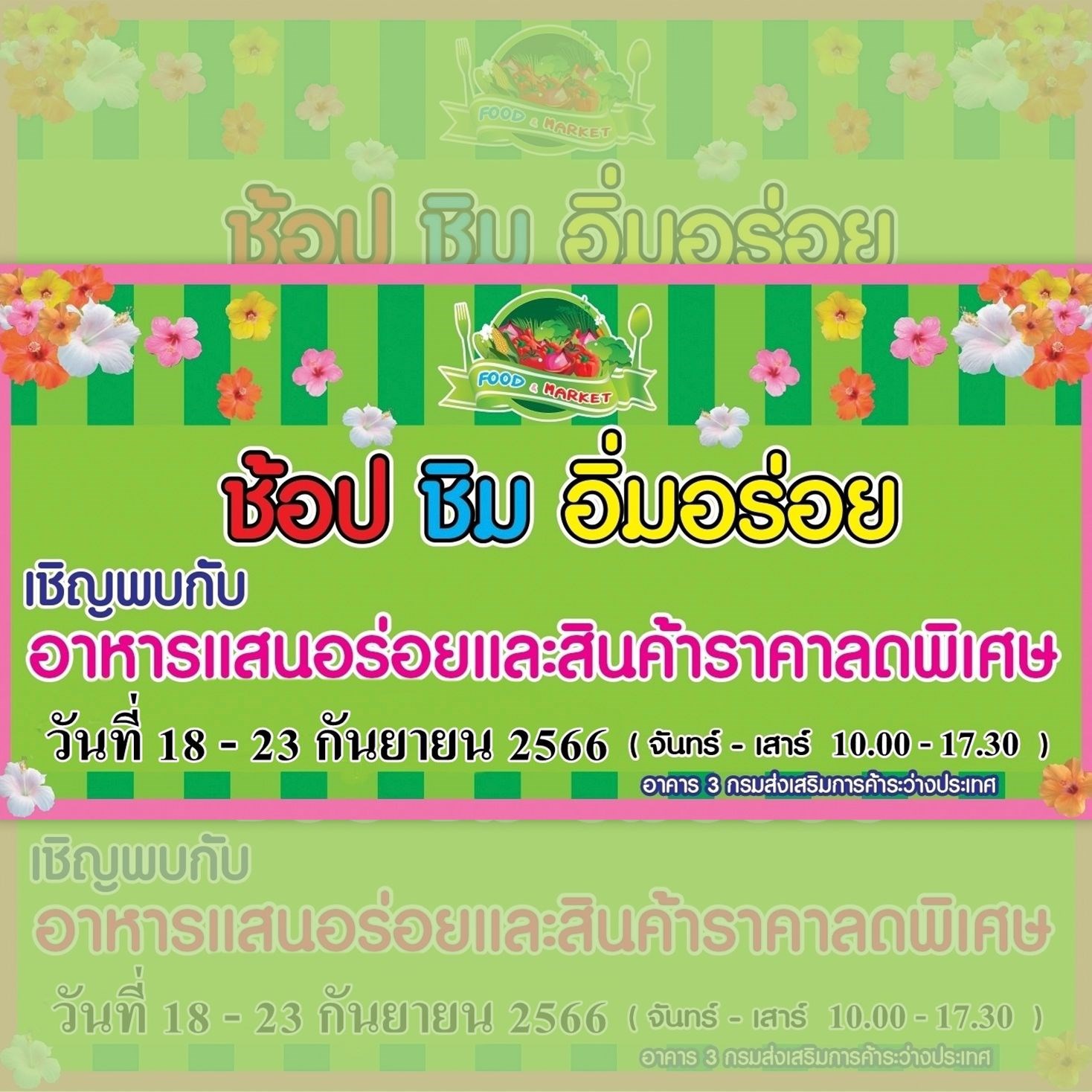 งานแสดงสินค้า ช้อป ชิม อิ่มอร่อย วันที่ 18 - 23 กันยายน 2566 เวลา 10.00 - 17.30 น. ณ อาคาร 3 ศูนย์อาหาร กรมส่งเสริมการค้าระหว่างประเทศ