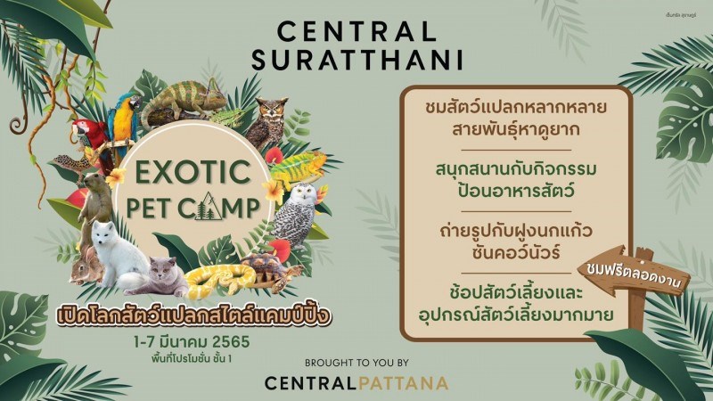 Exotic Pet Camp วันที่ 1 - 7 มีนาคม 2565 ณ เซ็นทรัล สุราษฎร์ธานี Exotic Pet Camp เปิดโลกสัตว์แปลกสไตล์แคมป์ปิ้ง ชวนเปิดโลกการเรียนรู้ ชมสัตว์แปลกหลากหลายสายพันธุ์หาดูยาก อาทิ กิ้งก่าคาเมเลี่ยนเวลล์ เต่ายักษ์ซูคาต้า งูบอลไพธอน สนุกสนานกับกิจกรรมป้อนอาหารสัตว์ ถ่ายรูปกับฝูกนกแก้วซัลคอว์นัวร์ และจุดถ่ายรูปสไลต์แคมป์ปิ้ง Workshop เพ้นท์ก้อนหินรูปสัตว์สุดน่ารัก ช้อปสัตว์เลี้ยงและสินค้าเกี่ยวกับสัตว์เลี้ยงมากมาย ณ พื้นที่โปรโมชั่นชั้น 1 หน้าร้าน Jaspal เซ็นทรัล สุราษฎร์ธานี