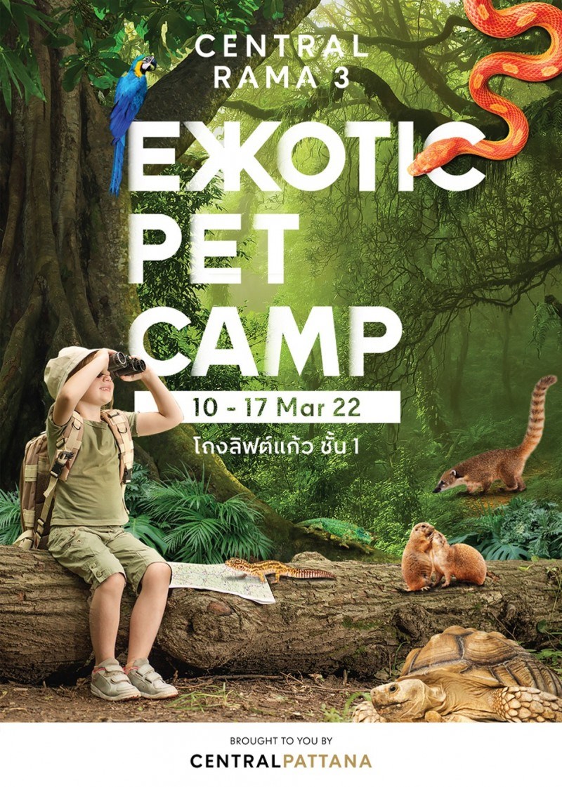 เตรียมตัวออกผจญภัยอีกครั้ง! กับ "Exotic Pet Camp" เปิดโลกแห่งการเรียนรู้ ชมสัตว์แปลกหาดูยากหลากหลายสายพันธุ์ พร้อมกิจกรรมแสนสนุกตลอดงาน ในบรรยากาศแบบเอาท์ดอร์แคมป์ปิ้ง พิเศษ! ช้อปสินคำสำหรับสัตว์เลี้ยง ราคาพิเศษเฉพาะในงานเท่านั้น วันที่ 10 - 17 มีนาคม 2565 ณ โถงลิฟต์แก้ว ชั้น 1 เซ็นทรัล พระราม 3