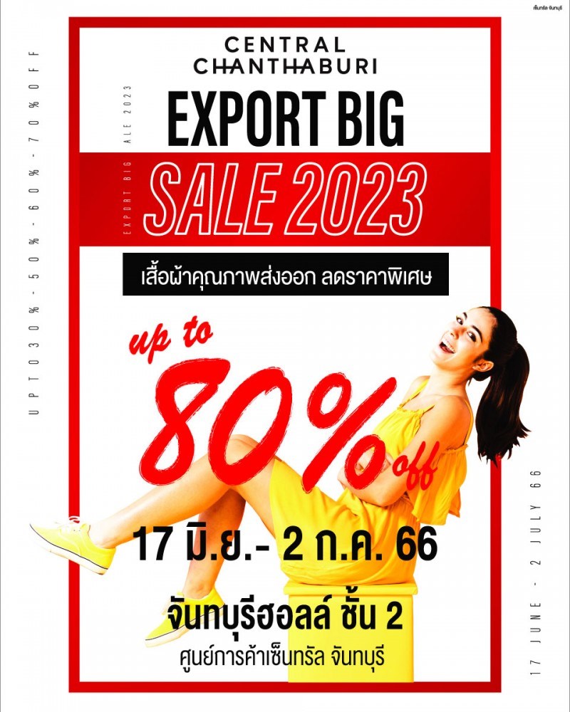 ฤดูแห่งการลดราคา มาถึงแล้วมาช้อปเสื้อผ้ากันให้จุใจกับงาน Export Big Sale 2023 ลดสูงสุด 80% เสื้อผ้าคุณภาพส่งออก จัดหนักจัดเต็มคุ้มค่า สายช้อปห้ามพลาด! พบกับเสื้อผ้าแฟชั่น เสื้อฮาวาย ชุดว่ายน้ำ เสื้อกันหนาว ชุดออกกำลังกาย เสื้อแจ็คเก็ต และ Collection ต่างๆอีกมากมาย ลดจุกๆ แล้วมาช้อปกันให้กระจายกันได้ที่ Chanthaburi Hall ชั้น 2 ศูนย์การค้าเซ็นทรัล จันทบุรี