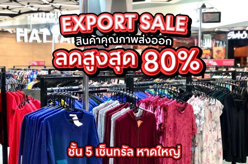 EXPORT SALE วันที่ 4 - 22 มีนาคม 2565 ณ เซ็นทรัล หาดใหญ่ กลับมาแล้ว เสื้อผ้าคุณภาพส่งออก EXPORT SALE ถูกมาก ถูกเว่อร์วัง งานดี เสื้อผ้าคุณภาพส่งออก ลดสูงสุด 80% ราคาเริ่มต้นเพียง 60 บาทเท่านั้น ตั้งแต่วันนี้ - 22 มีนาคม 2565 ณ ลานโปรโมชั่น ชั้น 5 เซ็นทรัล หาดใหญ่