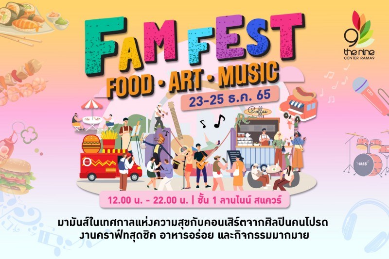 Hang Out นั่งชิลกับแก๊ง ที่งาน FAM Fest พร้อมฟังเพลงจากศิลปินคนโปรด อิ่มกับอาหารสุดอร่อย ในวันว่างกับบรรยากาศแสนพิเศษ ทำงานหนักมาทั้งปีก็ต้องมาพักผ่อน เพลิดเพลินยามค่ำคืน อาหารดี ! ดนตรีดี ! แบบนี้รีบมาเลย วันที่ 23 ธ.ค. 65 - 25 ธ.ค. 65 เวลา 12.00 - 22.00 น. ที่ชั้น 1 ลานไนน์สแควร์