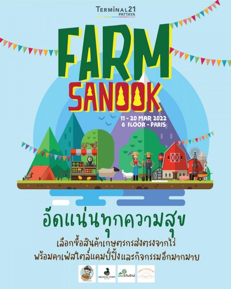 Farm Sanook วันที่ 11 - 20 มีนาคม 2565 ณ เทอร์มินอล21 พัทยา เอาใจสายรักสุขภาพด้วยสินค้าเกษตรกรส่งตรงจากไร่กับศูนย์การค้า Terminal21 พัทยา ในงาน ‘Farm Sanook’ งานนี้เหมือนยกฟาร์มมาไว้กลางเมืองกับเหล่าน้องสัตว์น่ารัก พร้อมคาเฟ่สไตล์แคมป์ปิ้งจากดอยช้างที่นำเมล็ดกาแฟทั้ง 9 สายพันธ์มาให้คุณลูกค้าได้ลิ้มลองและจัดเต็มทุกมุมให้ถ่ายรูปชิค ๆ ในบรรยากาศสุดชิว ระหว่างวันที่ 11 - 20 มีนาคม 2565