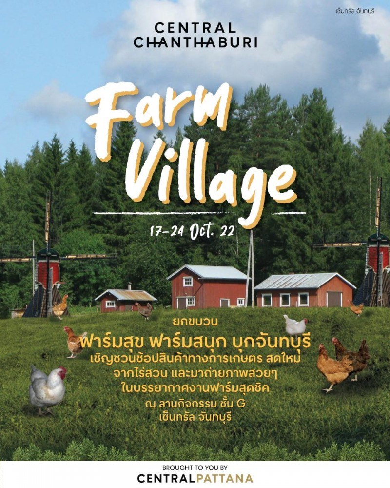 ยกขบวน ฟาร์มสุข ฟาร์มสนุก มาไว้ที่จันทบุรี กับงาน Farm Village เชิญชวนช้อปสินค้าทางการเกษตร สดใหม่จากไร่สวน พร้อมมุมถ่ายภาพ บรรยากาศสุดชิค วันที่ 17 - 24 ตุลาคม 2565 ณ ลานกิจกรรมชั้น G ศูนย์การค้าเซ็นทรัลจันทบุรี