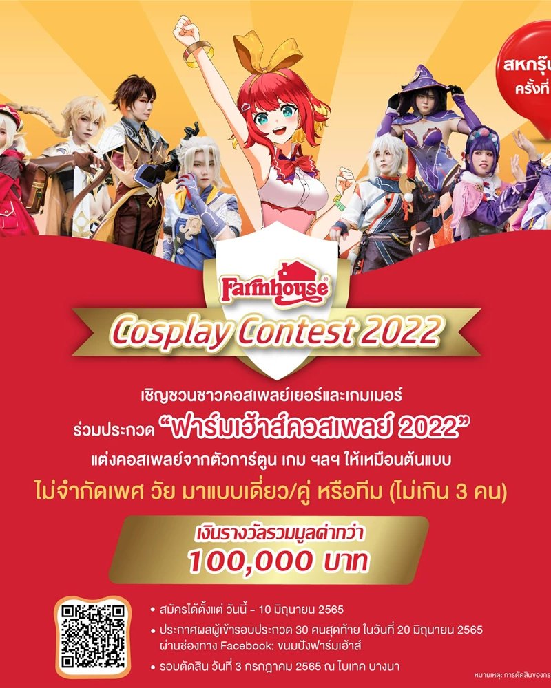 สาวกคอสเพลย์เยอร์และเกมเมอร์ เตรียมตัวให้พร้อม “ฟาร์มเฮ้าส์” เปิดเวทีจัด Farmhouse Cosplay Contest 2022 แข่งขันประกวดคอสเพลย์ จากการ์ตูน เกม ฯลฯ ให้เหมือนต้นแบบ ไม่จำกัดเพศและวัย เงินรางวัลรวมกว่า 100,000 บาท ในวันที่ 3 กรกฎาคม 2565 (ภายในงานสหกรุ๊ปแฟร์ ครั้งที่ 26) เวลา 13.00 น. ณ เวทีกลาง ไบเทคบางนา ส่งใบสมัครได้ที่ Line:
