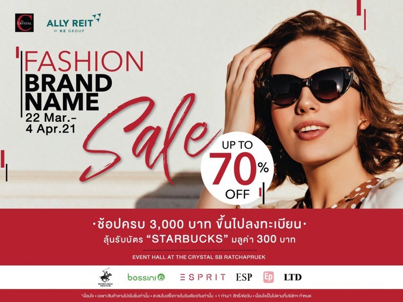 Fashion Brand Name Sale วันที่ 22 มีนาคม 2564 - 4 เมษายน 64 ณ Event Hall เดอะ คริสตัล เอสบี ราชพฤกษ์  ลดสุดปัง ลดสูงสุด 70% งานเซลไหน จะเลิศเท่างานนี้ ยกทัพแบรนด์ดัง มาจัดโปรเด็ดโดนใจขาช้อป Bossini, Beverly​ Hills Polo​ CLub, Esprit, Ep, LTD และ ESP