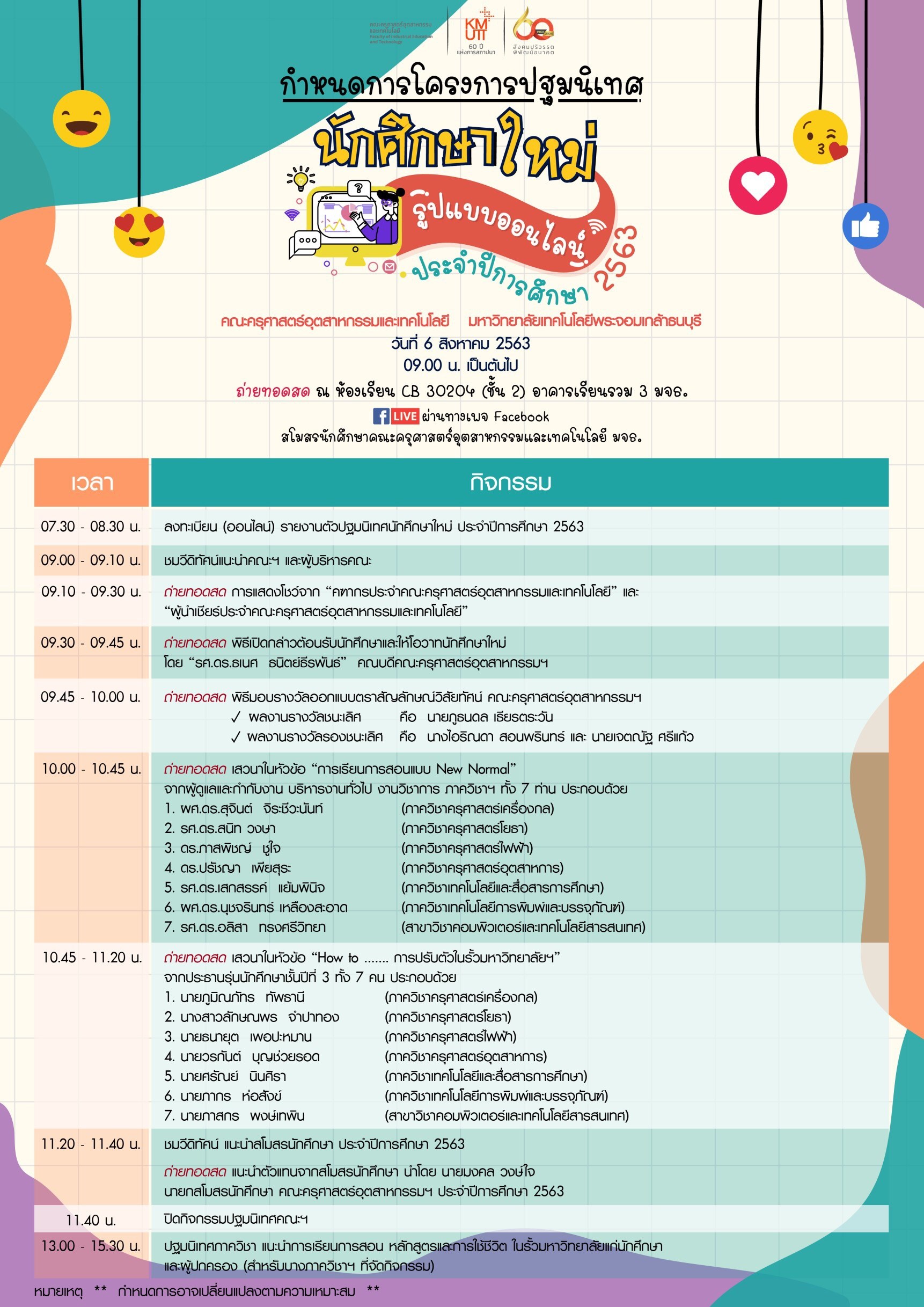 กำหนดการโครงการปฐมนิเทศนักศึกษาใหม่ ประจำปีการศึกษา 2563 (รูปแบบออนไลน์)