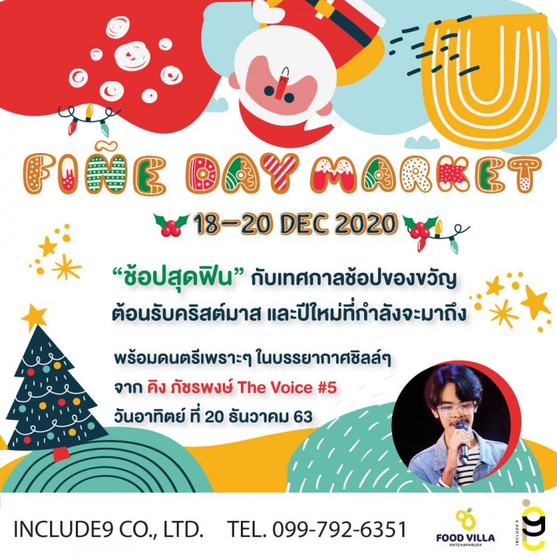 FINE DAY MARKET วันที่ 18 - 20 ธันวาคม 2563 ณ Food Villa Ratchaphruek FINE DAY MARKET 18-20 ธ.ค. 63 "ช้อปสุดฟิน" กับเทศกาลช้อปของขวัญ ต้อนรับเทศกาลคริสต์มาส และปีใหม่ที่กำลังจะมาถึง พร้อมดนตรีเพราะ ๆ ในบรรยากาศชิลล์ ๆ จาก คิง ภัชรพงษ์ The Voice #5 วันอาทิตย์ที่ 20 ธ.ค. 63 ตั้งแต่ 15:00 น.เป็นต้นไป