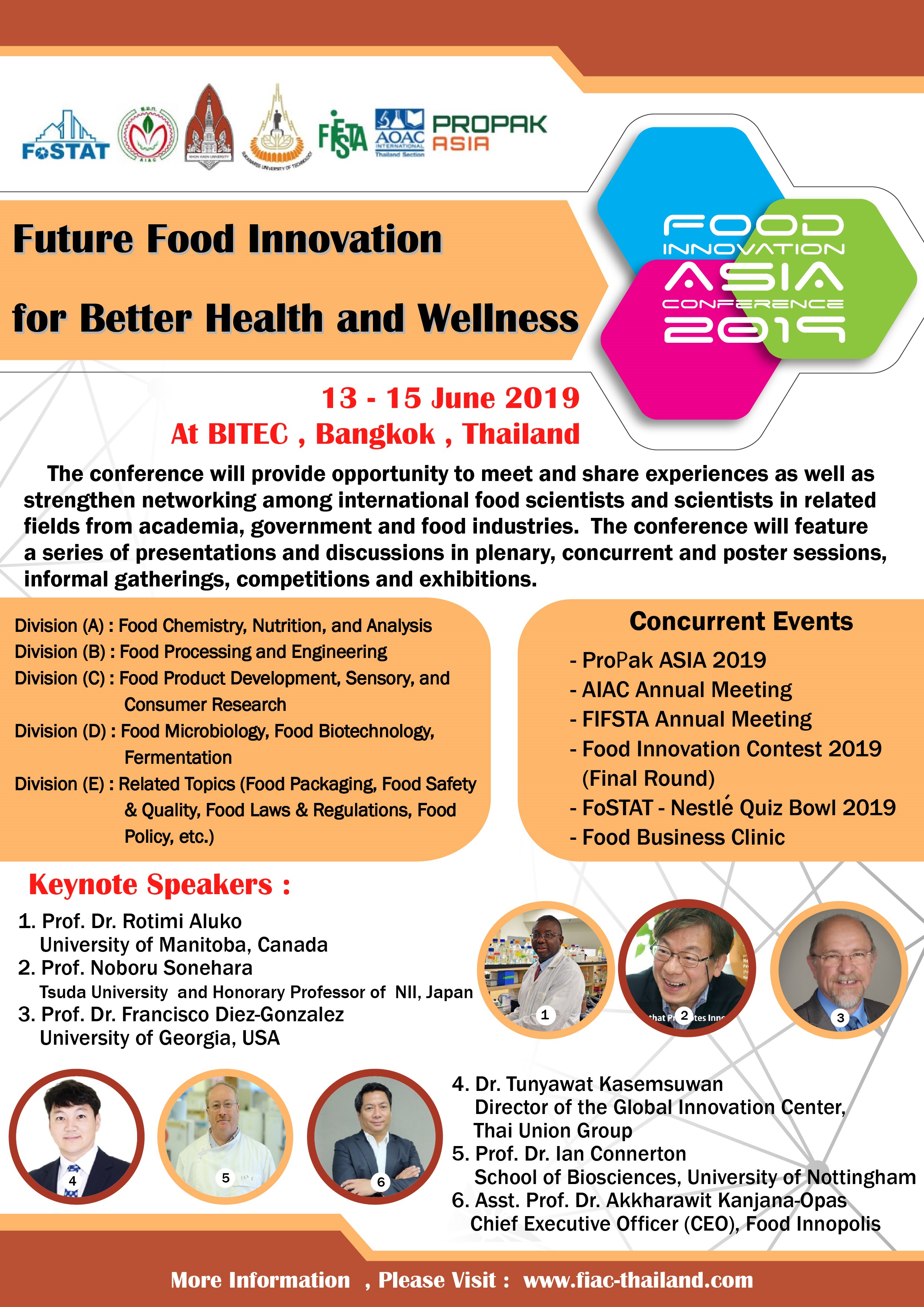 สมาคมวิทยาศาสตร์และเทคโนโลยีทางอาหารแห่งประเทศไทย (FoSTAT) ร่วมกับ บริษัท ยูบีเอ็ม เอเชีย (ประเทศไทย) จำกัด ผู้จัดงานโพรแพ็ค เอเชีย 2019 เชิญผู้ประกอบการและผู้สนใจในธุรกิจและอุตสาหกรรมอาหารเข้าร่วมการประชุมและสัมมนา นวัตกรรมอาหารแห่งเอเชีย 2019 (Food Innovation Asia 2019) โดยมีวัตถุประสงค์เพื่อมุ่งเน้นเผยแพร่ข้อมูลความรู้ด้านวิทยาศาสตร์และเทคโนโลยีอาหาร แนวโน้มล่าสุดของนวัตกรรมอาหารโลก รวมถึงแลกเปลี่ยนข้อมูลทางวิชาการและการดำเนินธุรกิจในอุตสาหกรรมอาหารกับผู้เข้าร่วมประชุม