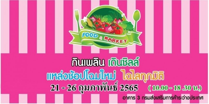 งานแสดงสินค้า FOOD MARKET วันที่ 21 - 26 กุมภาพันธ์ 2565 ณ อาคาร 3 ศูนย์อาหาร กรมส่งเสริมการค้าระหว่างประเทศ พบกับสินค้าคุณภาพส่งออกหลายรายการ อาทิ เช่น อาหารเลิศรส ขนมของฝาก สินค้า OTOP เสื้อผ้า เครื่องประดับจิวเวลรี่ สินค้าเพื่อสุขภาพและความงาน ของใช่ภายในบ้าน ฯลฯ และอื่น ๆ อีกมากมายภายในงาน
