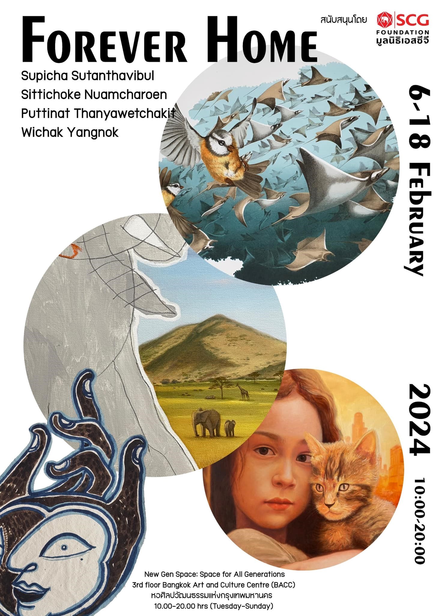 นิทรรศการ ‘Forever Home’ โดยศิลปินทั้ง 4 จะนำทางคุณสู่นิยามที่แตกต่างของคำว่าบ้าน โดยบ้านอาจไม่จำเป็นต้องหมายถึงวัตถุ หรือสิ่งที่เป็นรูปธรรมเสมอไป แต่อาจเป็นสิ่งที่เป็นนามธรรมเช่น ความรู้สึก ความรัก ความอบอุ่น และความผูกพัน ไม่ว่าสิ่งมีชีวิตใดๆ คน หรือสัตว์ก็ล้วนอยากอาศัยอยู่ใน ‘บ้าน’ หรือถิ่นที่อยู่อาศัยที่มีความสุขทั้งนั้น แต่หลายครั้งที่มนุษย์เราได้พรากอิสรภาพ และแยกพวกเขาออกจากความสุขนั้น หรือในบางครั้ง การเดินทางใช้ชีวิตก็ได้นำทางเรากลับมาสู่บ้านที่แท้จริงหรือบ้านเกิดซึ่งอาจเป็น ‘จุดจบเพียงเพื่อเริ่มต้นใหม่’ มาร่วมกันตามหาและแบ่งปัน ‘Forever Home’ ในเดือนแห่งความรักกันเถอะ