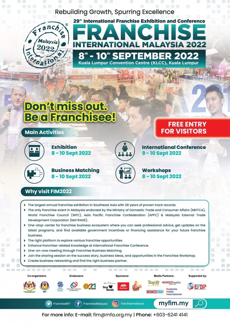 Franchise International Malaysia 2022 วันที่ 8 - 10 กันยายน 2565 ณ Kuala Lumpur Convention Centre (KLCC) FIM2022 นิทรรศการและการประชุมแฟรนไชส์ประจำปีซึ่งจัดอย่างเป็นทางการโดยสมาคมแฟรนไชส์มาเลเซีย (MFA) ร่วมกับกระทรวงการค้าภายในประเทศและกิจการผู้บริโภค (MDTCA) โซน Business Matching แพลตฟอร์มที่เปิดโอกาสแฟรนไชส์ได้พบปะกับแบรนด์แฟรนไชส์ที่เป็นที่ยอมรับผ่านการประชุมแบบตัวต่อตัว โดยเชื่อว่าการจับคู่ธุรกิจนี้จะช่วยให้แฟรนไชส์ที่มีศักยภาพมีความเข้าใจที่ดีขึ้นเกี่ยวกับผู้เข้าร่วมงานผ่านการคัดเลือกเบื้องต้นและการสำรวจเชิงลึกเพื่อเข้าใจความสนใจของผู้ที่มาเดินงาน ครอบคลุมมากกว่า 100 แบรนด์แฟรนไชส์ในประเทศและต่างประเทศ โซนเวทีการประชุม วัตถุประสงค์เพื่อให้แฟรนไชส์ในท้องถิ่นและผู้เชี่ยวชาญระดับนานาชาติจากส่วนต่าง ๆ ของโลกมารวมกัน เพื่อจุดประสงค์ในการแบ่งปันความรู้ ประสบการณ์ ผู้เข้าร่วมประชุมนำไปพัฒนาแฟรนไชส์และชี้ทิศทางธุรกิจ