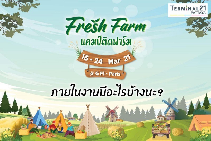 "FRESH FARM 2021" วันที่ 16 - 24 มีนาคม 2564 ณ ชั้น G-Paris Terminal21 พัทยา สุขล้นสวน FRESH FARM ประสบการณ์ช้อปติดฟาร์มครั้งยิ่งใหญ่กำลังจะกลับมา เทศกาลของอร่อยจากสวน FRESH FARM 2021 ช้อปกลางสวน อร่อยกลางฟาร์ม สินค้าคุณภาพสดจากไร่ ท่ามกลางความสนุกสนานในรูปแบบใหม่สไตล์แคมปิ้ง คัดของดี หลากหลายภูมิภาค จากชาวสวนชาวไร่ ไม่ต้องไปซื้อที่ไหนไกล งานนี้เรารวบมาให้แล้ว