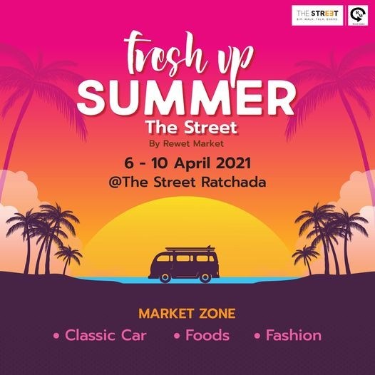 Fresh Up Summer วันที่ 6 - 10 เมษายน 2564 เวลา 16.00 - 24.00 น. ณ ลานด้านหน้า ศูนย์การค้า เดอะ สตรีท รัชดา ไปทะเลจะได้ยินเสียงคลื่น แต่ถ้าเติมความสดชื่นต้องมางาน "Fresh Up Summer" ยกบรรยากาศริมชายหาด พร้อมกับ Van Surf นำมาไว้บนถนนรัชดาภิเษก อิ่มอร่อยไปกับร้าน Street Food มากกว่า 30 ร้านค้าและร้านค้าแฟชั่น ชิค ชิค เครื่องประดับ DIY สุดคิวท์ ให้ช้อปกันอย่างจุใจ เพื่อต้อนรับหน้าร้อน แล้วผ่อนคลายไปกับดนตรีสด บรรยากาศชิล ๆ ก่อนกลับบ้าน แล้วพบกับ Fresh Up Summer เติมความสดชื่นในช่วงหน้าร้อน