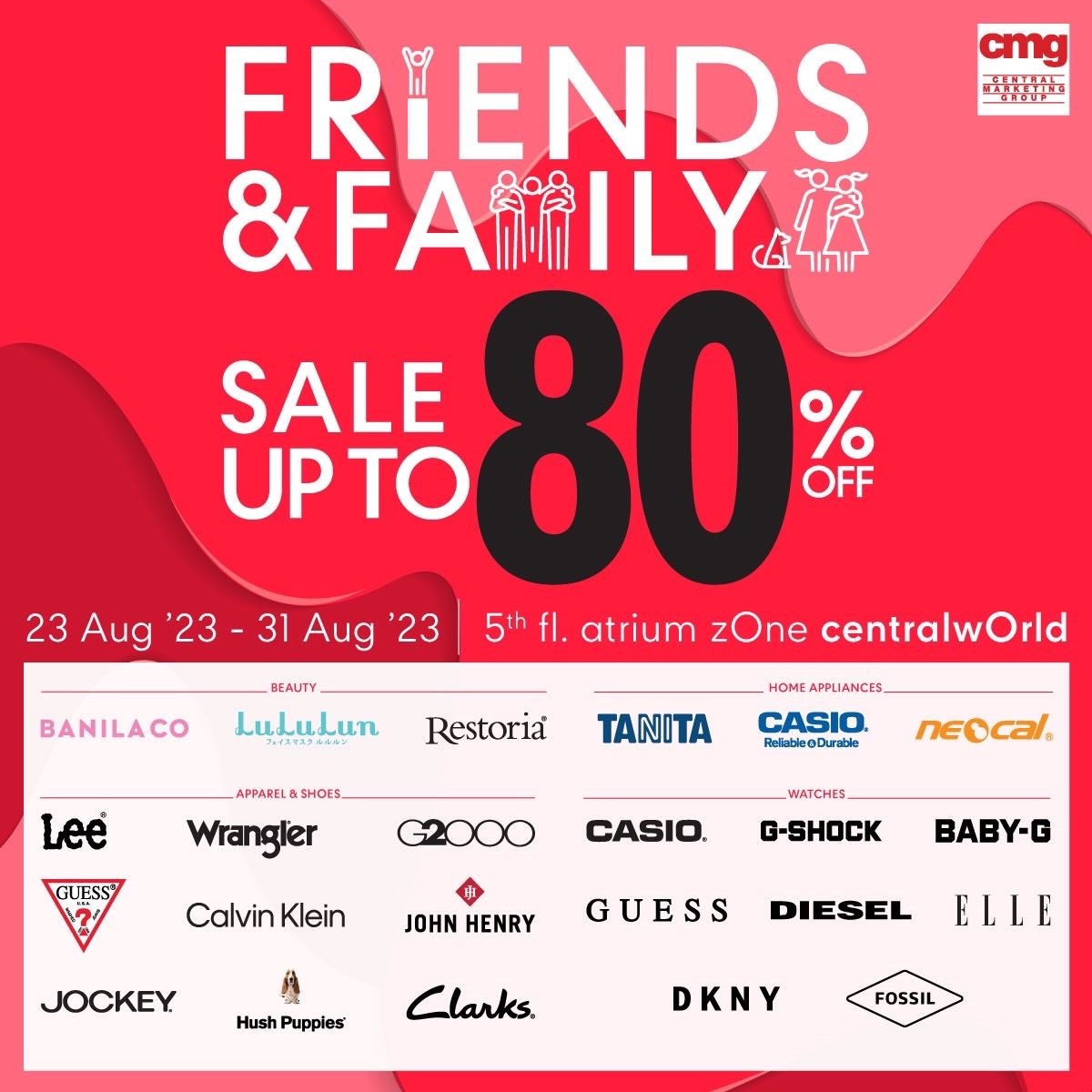 กลับมาอีกครั้งกับงาน Friend & Family sale รวมไอเทมเด็ด โปรแรงจากแบรนด์ชั้นนำในเครือ cmg มาลดกันแบบฉ่ำๆ ทุกไอเทม พร้อมส่วนลดสูงสุดถึง 80% วันที่ 23 - 31 ส.ค. 66 เวลา 10.00 - 21.00 น. ณ Central World ชั้น 5 โซน Atrium