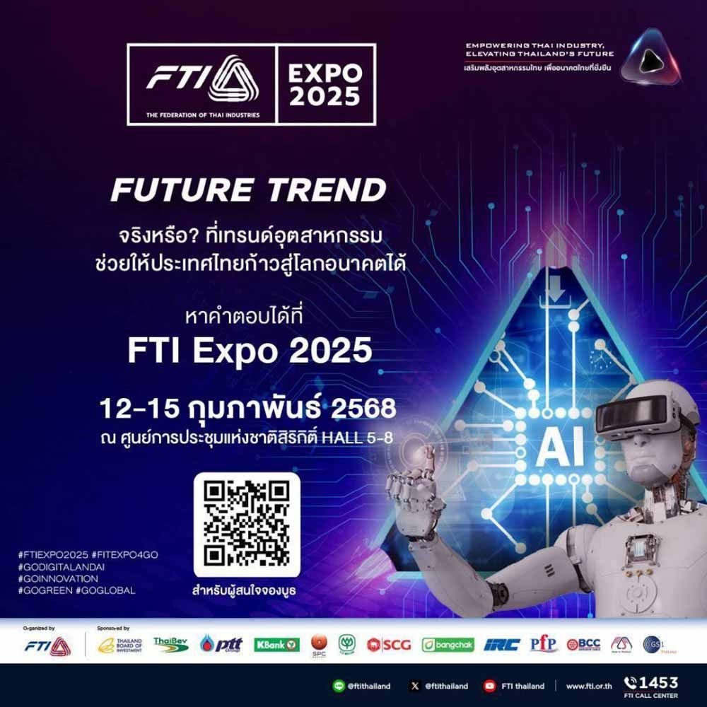 เตรียมพบกับ FTI EXPO 2025: EMPOWERING THAI INDUSTRY, ELEVATING THAILAND'S FUTURE เสริมพลังอุตสาหกรรมไทย เพื่ออนาคตไทยที่ยั่งยืน มหกรรมรวมพลังขับเคลื่อนไทยสู่อุตสาหกรรมแห่งอนาคต พบกับ "Immersive Experience" บอกเล่าเรื่องราวการพัฒนาอุตสาหกรรมไทย ดื่มด่ำกับนวัตกรรม พร้อมสัมผัสเทรนด์อุตสาหกรรมแห่งอนาคต จุดประกาย SMEs ให้เติบโต ด้วยเวทีเสริมทักษะทางธุรกิจโดยกูรูมากประสบการณ์ จุใจกับโซนสินค้าคุณภาพจากโรงงานผู้ผลิตกว่า 1,000 ร้านค้าทั่วประเทศและโซนจับคู่ธุรกิจที่ทำให้คุณมีเครือข่ายสู่ตลาดโลก