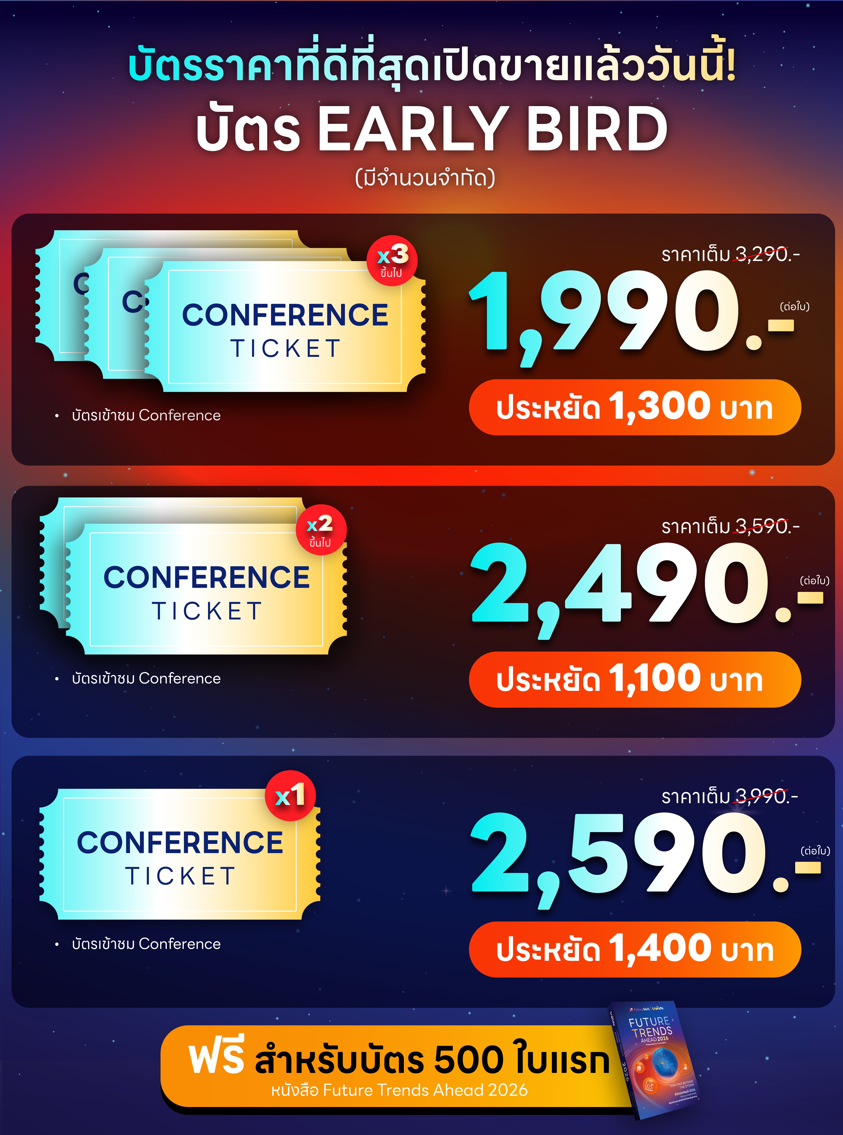 - ราคาพิเศษสำหรับซื้อบัตร 10 ใบขึ้นไป- เข้าร่วมสัมมนา Future Trends Ahead Summit 1 วันเต็ม*บัตรมีจำนวนจำกัด