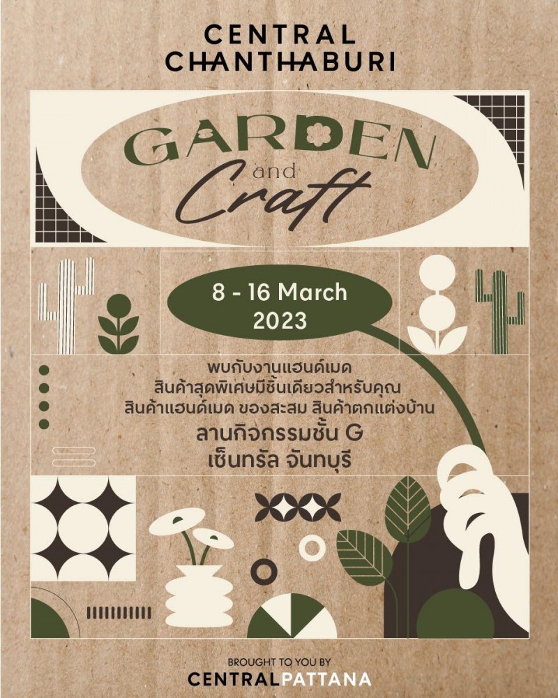 เตรียมพบกับงาน Garden and Craft ที่ยกขบวนงานแฮนด์เมด สินค้าสุดพิเศษที่เป็นสไตล์คุณ หรือของสะสม และสินค้าตกแต่งบ้าน แล้วพบกันที่ลานกิจกรรมชั้น G ศูนย์การค้าเซ็นทรัลจันทบุรี วันที่ 8 - 16 มี.ค 66