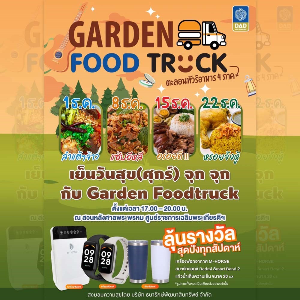 GARDEN FOOD TRUCK ตะลอนทัวร์อาหาร 4 ภาค เย็นวันศุกร์ วันที่ 1, 8, 15, 22 ธันวาคม 2566 ตั้งแต่เวลา 17.00 - 22.00 น. ณ สวนหลังศาลพระพรหม ศูนย์ราชการเฉลิมพระเกียรติ ฯ แจ้งวัฒนะ ลุ้นรางวัลสุดปังทุกสัปดาห์ เครื่องฟอกอากาศ M-HORSE, สมาร์ทวอทช์ Redmi Smart Band 2, แก้วน้ำเก็บความเย็น ขนาด 20 oz ส่งมอบความสุขโดย บริษัท ธนารักษ์พัฒนาสินทรัพย์ จำกัด