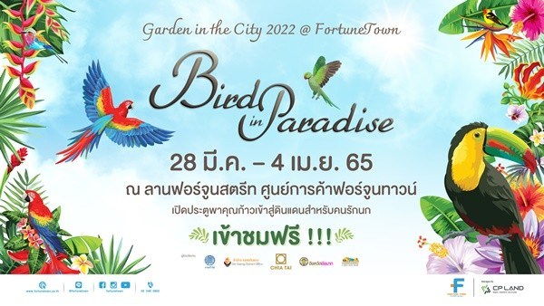 ศูนย์การค้าฟอร์จูนทาวน์ เปิดประตูพาคุณ ก้าวเข้าสู่ดินแดนสำหรับคนรักนก ในงาน Garden in the City 2022 @ Fortune Town : Bird in Paradise ในวันที่ 28 มีนาคม - 4 เมษายน 2565 ซึ่งจัดเป็นกิจกรรมเพื่อส่งเสริมการรักธรรมชาติและสิ่งแวดล้อมในเมือง โดยภายในงานพบกับความน่ารักของเหล่านกนานาพันธุ์ที่มาให้สัมผัสอย่างใกล้ชิด อาทิ นกแก้วแอฟริกันเกรย์ ที่ขื่อฉลาดที่สุดในโลก, เจ้าของฉายาราชาแห่งนก นกฟินซ์เจ็ดสี หรือนกสายรุ้ง, นกเลิฟเบิร์ด เป็นต้น นอกจากนี้ภายในงานมีการออกร้านจำหน่ายต้นไม้ อุปกรณ์การปลูกต้นไม้ และสินค้าอื่นๆ อีกมากมายให้เลือกสรร มีการจำหน่ายของดีเมืองชัยนาท ผลิตภัณฑ์ทางการเกษตร ให้ช้อป ชิม อาหารอร่อย พร้อมจิบชา กาแฟ เพลิดเพลินไปกับเสียงเพลง ที่จะมาสร้างสีสรรค์ พิเศษ ร่วมสนุกภายในงาน รับกล้าไม้จากกรมป่าไม้ เมล็ดพันธุ์ผักเจียไต๋ และน้ำปุ๋ยหมักชีวภาพจากสำนักงานเขตดินแดง เปิดเข้าชมฟรีตลอดทั้งงาน บริเวณ ณ ลานฟอร์จูนสตรีท หน้าศูนย์การค้าฟอร์จูนทาวน์