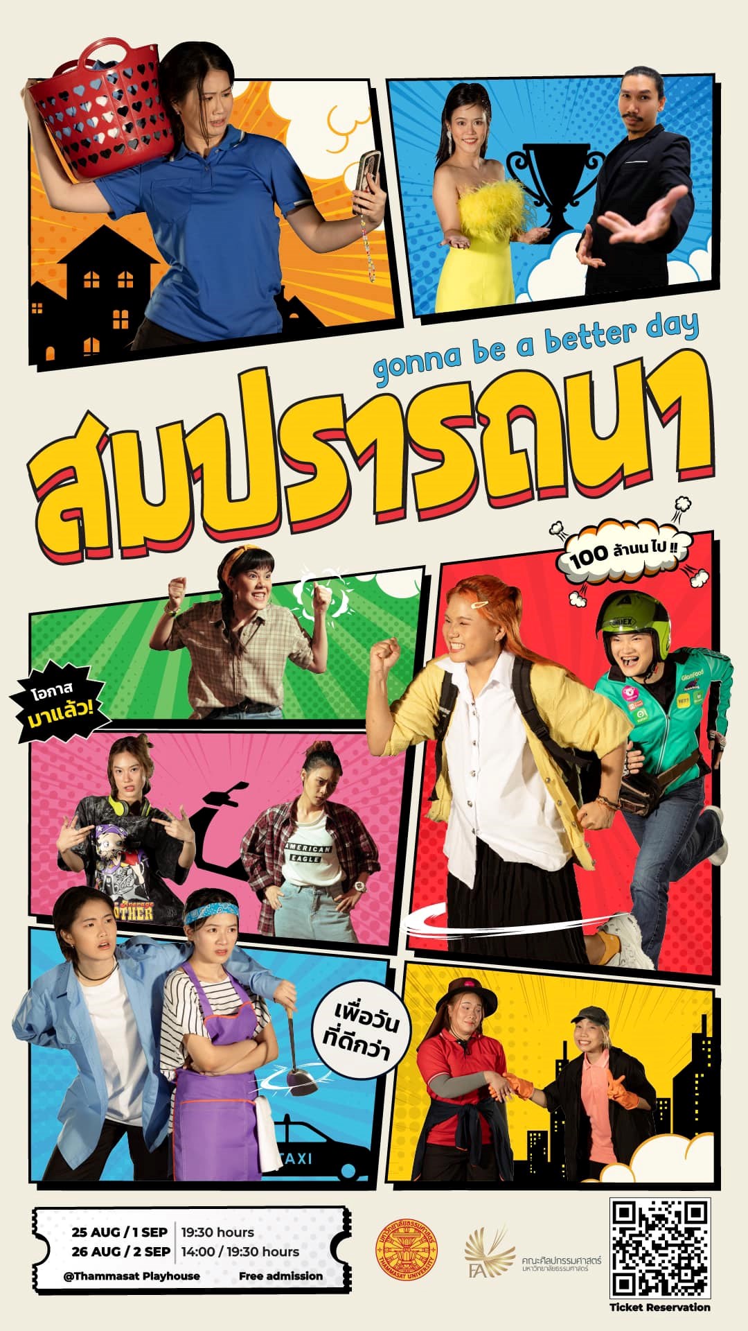 โรงละคอนมธ. เปิดม่านต้อนรบัตรผู้ชมทั่วประเทศอีกครั้ง! ปลายสิงหาคมนี้ห้ามพลาดกับการกลับมาของละคอนเวทีประจำปี เปิดให้ชมฟรีทุกรอบการแสดงแล้วมา สมปรารถนาไปพร้อมกัน คณะศิลปกรรมศาสตร์ มหาวิทยาลัยธรรมศาสตร์ กลับมาจัดละคอนเวทีประจำปีอีกครั้งในรอบ 3 ปีครั้งนี้ได้นำละคอนเรื่อง สมปรารถนา (Gonna be a better day) ของกลุ่ม ละคร Scarlett Theatre ศิษย์เก่าจากสาขาการละคอน ที่เคยจัดแสดงไปแล้วในช่วงต้นปีมา ปัดฝุ่นและนำเสนอใหม่ในรูปแบบของละคอนคณะ จัดแสดงทั้งหมด 6 รอบการแสดง ได้แก่