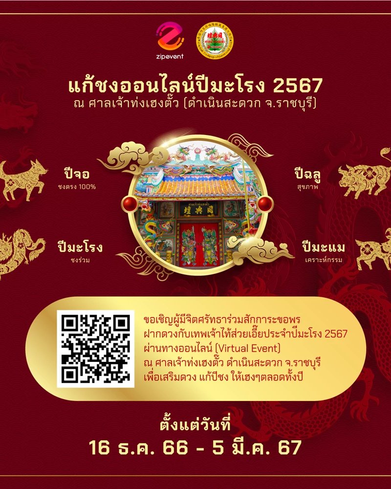 Zipevent และ ศาลเจ้าท่งเฮงตั๊ว ขอเชิญทุกๆท่านที่มีจิตศรัทรา ร่วมสักการะขอพรพระคุณเจ้ารับปีใหม่ ฝากดวงกับเทพเจ้าไท้ส่วยเอี๊ย เพื่อสะเดาะเคราะห์ เสริมดวง แก้ปีชง ให้แคล้วคลาดปลอดภัย เฮงๆ ทั้งปี ผ่านทางออนไลน์(Virtual Event) ณ ศาลเจ้าท่งเฮงตั๊ว ดำเนินสะดวก จ.ราชบุรี ระหว่างวันเสาร์ที่ 16 ธันวาคม 2566 - อังคารที่ 5 มีนาคม 2567