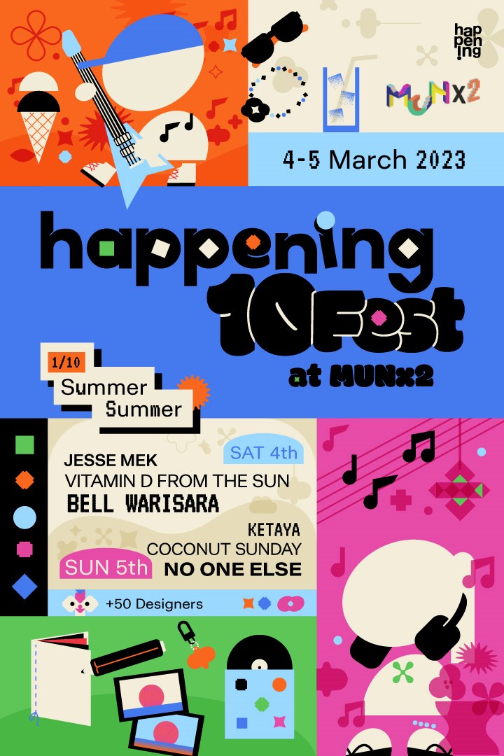 ชวนทุกคนมาพบกับบรรยากาศอบอุ่นแต่ไม่อบอ้าวในงาน happening 10Fest ครั้งที่ 1/10 ในธีม ‘Summer Summer’ ที่จะยกขบวนเหล่าศิลปิน อย่าง Bell Warisara, No One Else, Jesse Mek, Ketaya, Vitamin D from the Sun และ Coconut Sunday มาร่วมแสดงคอนเสิร์ตให้อบอุ่นใจ และยังมีแบรนด์ต่างๆ ที่มาพร้อมสินค้าพิเศษ และโปรโมชั่นจัดเต็ม ไม่ว่าจะเป็น สำนักพิมพ์ Fullstop, Waxvalley Candle co., try2benice&far_andco, BooBoo.png, May Wai, SUMPHARA, Pim.nanya, Khemtit และอีกมากมายมาร่วมออกร้านและร่วมจัด Special Product & Promotion กับพวกเรา!