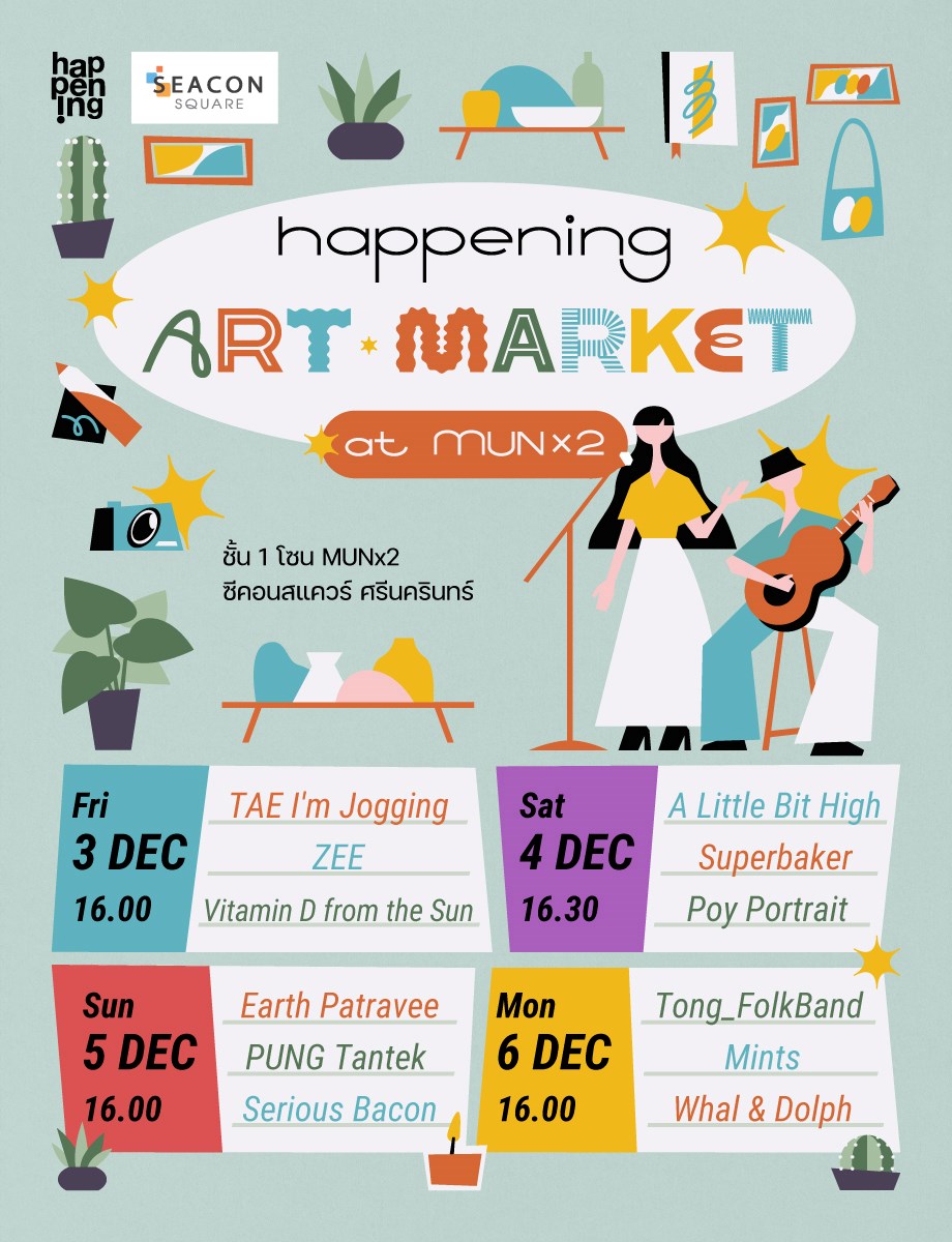 กลับมาอีกครั้ง ในวันที่สถานการณ์คลี่คลาย ทีม happening จับมือกับ Seacon Square จัดงานอาร์ตมาร์เก็ตขนาดใหญ่ ในโซนใหม่เอี่ยมของศูนย์สรรพสินค้าซีคอนสแควร์ ที่ชื่อโซนว่า MUNx2 (อ่านว่า มัน-มัน) ซึ่งเป็นโซนสำหรับคนชอบศิลปะ ดนตรี ร้านกาแฟ ความคิดสร้างสรรค์ การถ่ายภาพ และอะไรสนุกๆ อีกเพียบ ในโซนนี้มีทั้งห้องสมุด TCDC Commons และแกลเลอรี่ภาพถ่ายอย่าง HOP Hub Of Photography ให้มาเยือน มีร้านกาแฟ ร้านขนมน่ารักๆ หลายร้าน และสำหรับในงานนี้เราจะขนแบรนด์ดีไซน์และศิลปินที่เป็นเพื่อนๆ ของ happening รวมทั้งร้าน happening shop แบบ Pop Us Store ไปออกบูทเป็นอาร์ตมาร์เก็ตราว 50 บูท มีกิจกรรมสนุกๆ ทั้งเวิร์กช็อป และการแจกของขวัญ ที่สำคัญมีวงดนตรีไปแสดงให้ดูกันแบบสบายๆ ไม่เบียดเสียด อาทิ Whal & Dolph, Earth Patravee, Superbaker, Mints, ZEE, Vitamin D from the Sun และอีกมาก! มาทำความรู้จักกับศูนย์รวมความอาร์ตแห่งใหม่