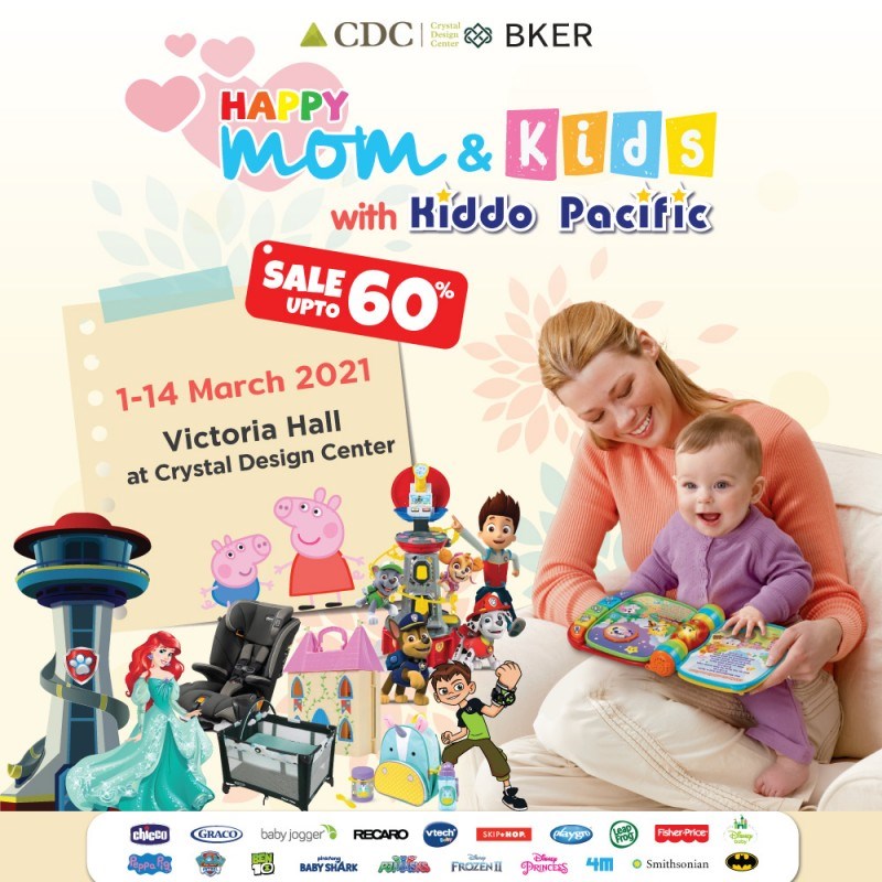 Happy Mom & Kids วันที่ 1 - 14 มีนาคม 2564 ณ Victoria Hall The Crystal Ekamai-Ramindra พบกับงาน Happy Mom & Kids สินค้าของเล่นเด็ก ของใช้คุณแม่และเด็ก ในเครือ Kiddo Pacific ราคาลดสูงสุด 60% พร้อมแล้วที่จะให้คุณแม่ คุณน้องได้มาช็อปปิ้งสินค้าคุณภาพดี ไม่ว่าจะเป็น คาร์ซีท, เตียงเด็ก, รถเข็นเด็ก, ของใช้สำหรับเด็ก ของเล่นและอื่น ๆ อีกมากมาย จะได้พบกับสินค้าแบรนด์ดัง ลิขสิทธิ์แท้ เช่น Chicco, Graco, Baby jogger, Recaro, Paw Patrol, Peppa Pig, Disney, Batman เป็นต้น