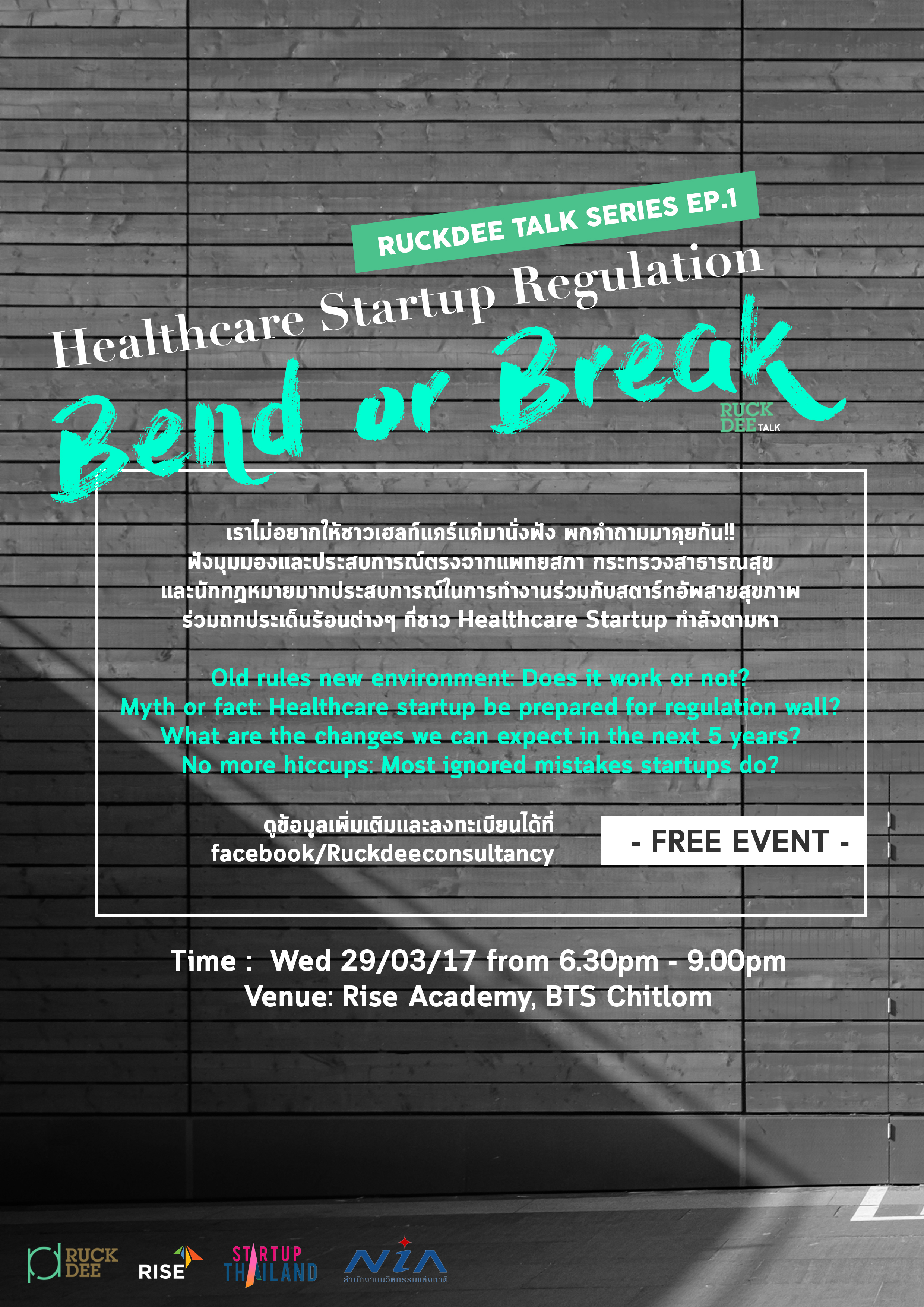 หากคุณเป็นคนหนึ่งที่กำลังสนใจในเทคโนโลยีสุขภาพหรือกำลังเริ่มต้นทำโปรเจกต์เกี่ยวกับสุขภาพ และอยากรู้ว่าคุณจะสามารถทำธุรกิจโดยได้รับความร่วมมือกับหน่วยงานภาครัฐ ข้ามผ่านข้อจำกัดทางกฏหมายให้ไม่สะดุดได้อย่างไรบ้าง Ruckdee ขอนำเสนอกิจกรรม Talk Series ครั้งแรกจาก Ruckdee มาประเดิมกันในประเด็นที่ชาว Healthcare Startup กำลังตามหาอยู่