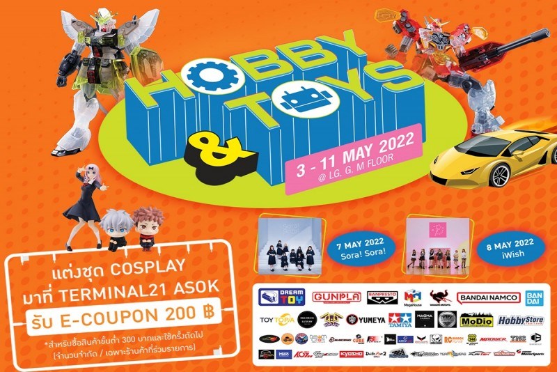 กลับมาอีกครั้งกับงาน Hobby & Toys ที่รวบรวมของเล่นและของสะสม ไอเท็มเด็ด ไอเท็มปังมาไว้ในงานเดียว ไม่ว่าจะเป็น Dream Toy, GUNPLA, BANPRESTO, MegaHouse, Tamashii, Bandai Namco, Bandai, TOYTOPIA, BKK BRICK LUXURY, TOYLAXY, YUMEYA, TAMIYA, P&Y Toys, Nymph Toys Shop, KIZZ MODEL, DreamCraft, Majorette และอื่น ๆ พิเศษ! แต่งชุด Cosplay มาที่ Terminal21 Asok รับ E-coupon มูลค่า 200 บาท สำหรับซื้อสินค้าในงานขั้นต่ำ 300 บาทและใช้ครั้งถัดไป (จำนวนจำกัด/เฉพาะร้านค้าที่ร่วมรายการ)