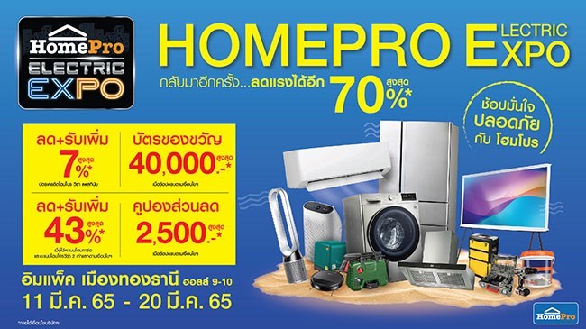 วันที่ 11 - 20 มีนาคม 2565 ณ Hall 9-10 อิมแพ็ค เมืองทองธานี กลับมาอีกครั้ง ลดแรงได้อีก...กับสินค้าเครื่องใช้ไฟฟ้าและผลิตภัณฑ์ ของใช้ภายในบ้าน กับงาน โฮมโปร อิเลคทริค เอ็กซโป ครั้งที่ 1 ที่อิมแพ็คฮอล 9-10 ตั้งแต่วันที่ 11 - 20 มีนาคม 2565 นี้ พบกับสินค้าแบรนด์ดังมากมาย ลดแรงสูงสุดถึง 70% และสำหรับสมาชิกโฮมการ์ด รับข้อเสนอสุดพิเศษถึง 4 ดีล กลับมาครั้งนี้ เอาใจนักช้อปสาย(งาน)แฟร์ตัวจริง ดีลที่ 1 : ลด + รับเพิ่มสูงสุด 7% เมื่อใช้จ่ายผ่านบัตรเครดิตโฮมโปร วีซ่า แพลทินัม ดีลที่ 2 : รับบัตรของขวัญสูงสุด มูลค่า 40,000 บาท เมื่อช้อปครบตามเงื่อนไข ดีลที่ 3 : เมื่อลูกค้าใช้คะแนนโฮมการ์ด และคะแนนโฮมโปร วีซ่า2 เท่าแลกตามเงื่อนไข ลด + รับเพิ่มสูงสุดถึง 43% ดีลที่ 4 : รับคูปองส่วนลด สูงสุด 2,500 บาทเมื่อช้อปครบตามเงื่อนไข อย่าช้า!!! ดีลดี ดีลเด็ด ดีลแรงแบบนี้ ผ่านมาเพียง 10 วันเท่านั้น วันที่ 11 - 13 มี.ค. 2022 เวลา 10.00 - 22.00 น. วันที่ 14 - 17 มี.ค. 2022 เวลา 10.30 - 21.00 น. วันที่ 18 - 20 มี.ค. 2022 เวลา 10.00 - 22.00 น.