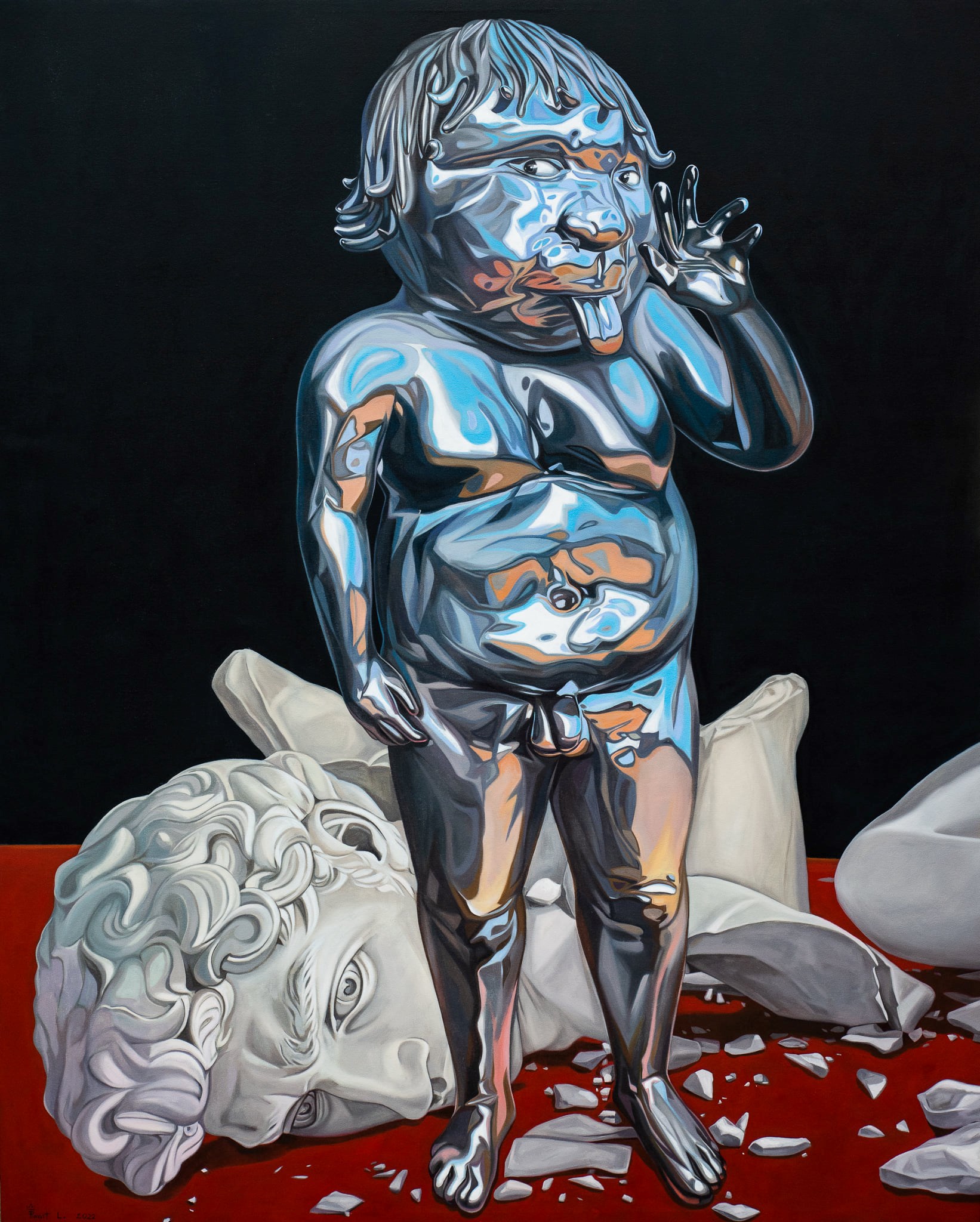 I am You” exhibition Prawit Lumcharoen presents an oil painting, expressing through a recreating simulated situation by making WIT fit in a certain situation in order to replace or compare to his favorite artists works for instance “My balloon, after Girl with balloon, Banksy” 109x145 cm. relating to a story of losing hope, dreams, love and innocence, the language of Banksy work with the title “There is always hope”. An artist recreated a story and an imagination to connect with the work that a girl is losing her balloon yet, there is another person brings back her balloon. And “Single mom, after Andrew Wyeth, 140x170 cm.” “Christina’s world 1948” the famous work of Andrew Wyeth. An artist recreated the work with an Asian female lying down on the ground in a big field without trees, full of isolation and loneliness, a desperate atmosphere among her children. However, each work of him tended to be ridiculing, regarding and connecting with those globally significant artworks in the world of art, sculptures and several photographs. Stepping into the world of favorite arts, to the unique expression, recreated them to be his own original work and turned to be this exhibition “I am You”
